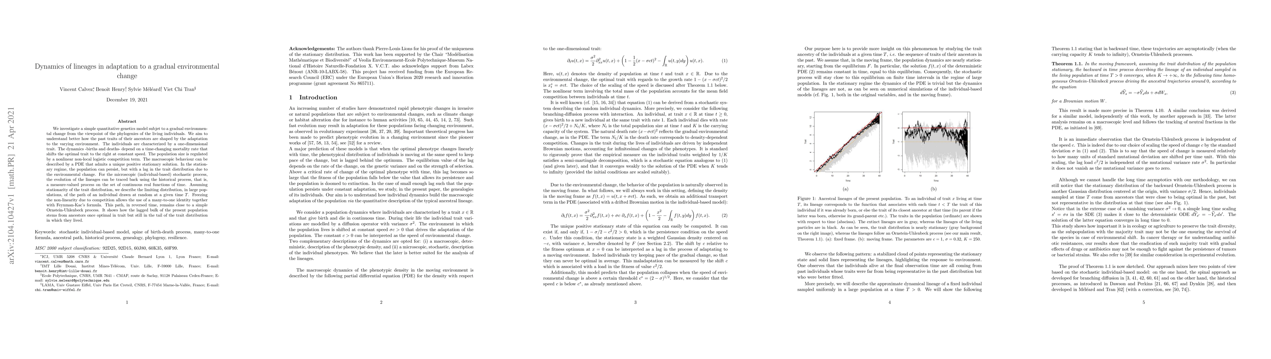 This paper examines a quantitative genetics model under gradual environmental change to understand how ancestral traits influence adaptation. It finds that while the population can persist, there is a lag in trait distribution due to environmental shifts, with lineages tracing back to ancestors that were once optimal but now reside in the trait distribution's tail.