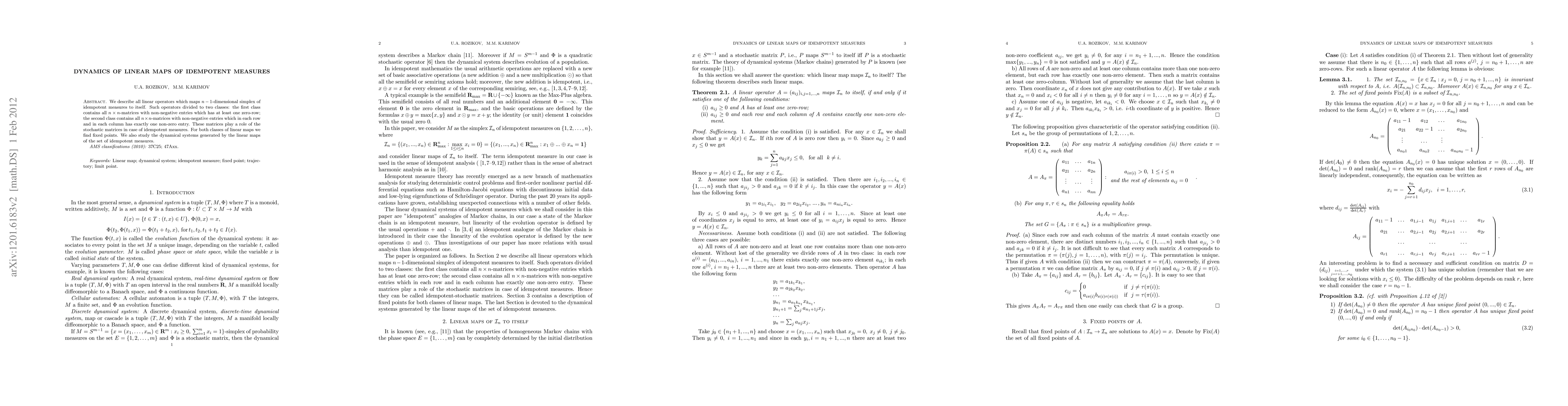This paper classifies linear operators mapping an $n-1$-dimensional simplex of idempotent measures to itself into two classes: matrices with at least one zero-row and matrices with exactly one non-zero entry per row and column. It identifies fixed points for both classes and examines the dynamical systems they generate.
