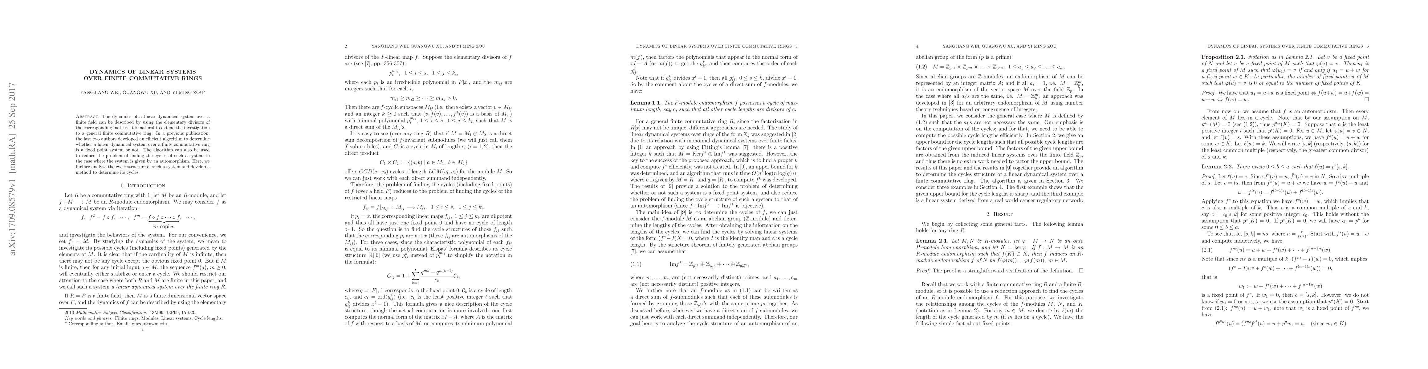 This paper investigates the dynamics of linear systems over finite commutative rings, extending previous work on linear dynamical systems over finite fields. It develops a method to determine the cycle structure of these systems, building on an algorithm to identify fixed points and reduce cycle-finding to automorphism cases.