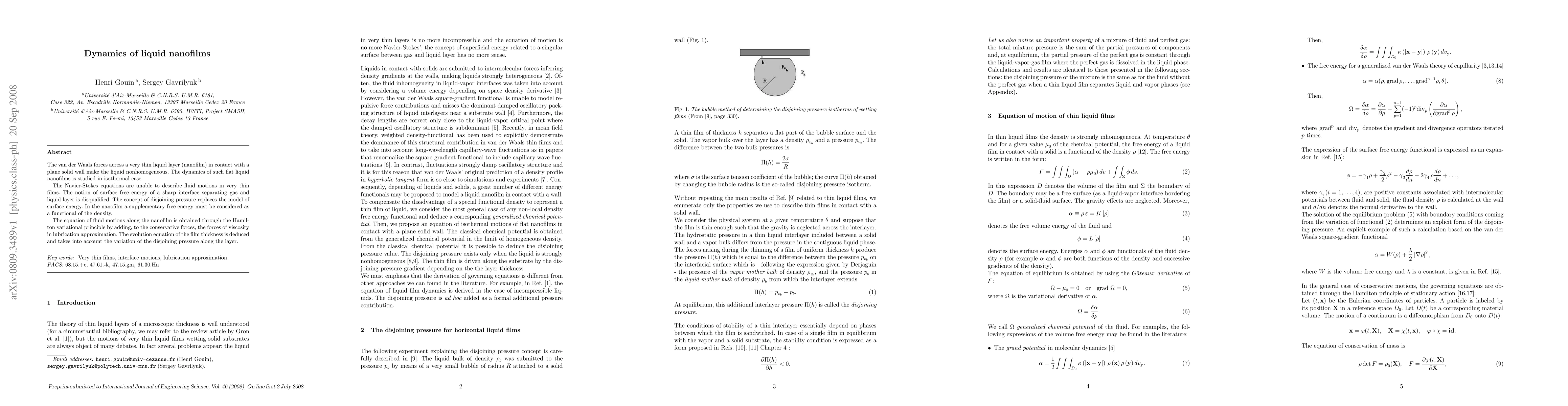 The van der Waals forces across a very thin liquid layer (nanofilm) in contact with a plane solid wall make the liquid nonhomogeneous. The dynamics of such flat liquid nanofilms is studied in isothermal case. The Navier-Stokes equations are unable to describe fluid motions in very thin films. The notion of surface free energy of a sharp interface separating gas and liquid layer is disqualified. The concept of disjoining pressure replaces the model of surface energy. In the nanofilm a supplementary free energy must be considered as a functional of the density. The equation of fluid motions along the nanofilm is obtained through the Hamilton variational principle by adding, to the conservative forces, the forces of viscosity in lubrication approximation. The evolution equation of the film thickness is deduced and takes into account the variation of the disjoining pressure along the layer.