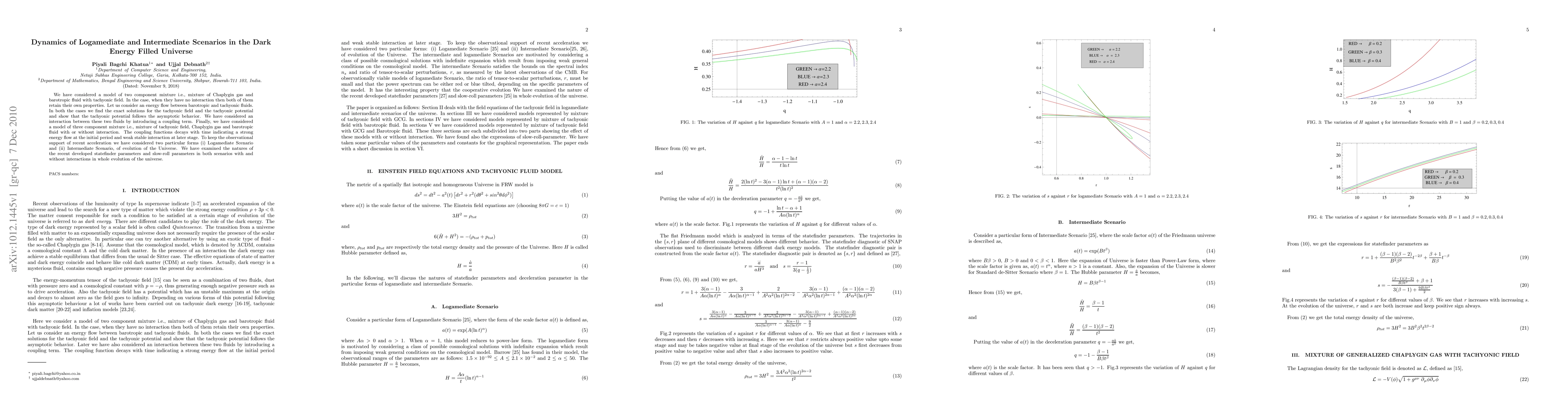 This paper explores a model of dark energy comprising Chaplygin gas, barotropic fluid, and tachyonic field, examining their dynamics both with and without interactions. It finds exact solutions for the tachyonic field and potential, and investigates the Logamediate and Intermediate scenarios to support observational evidence for the universe's accelerated expansion.