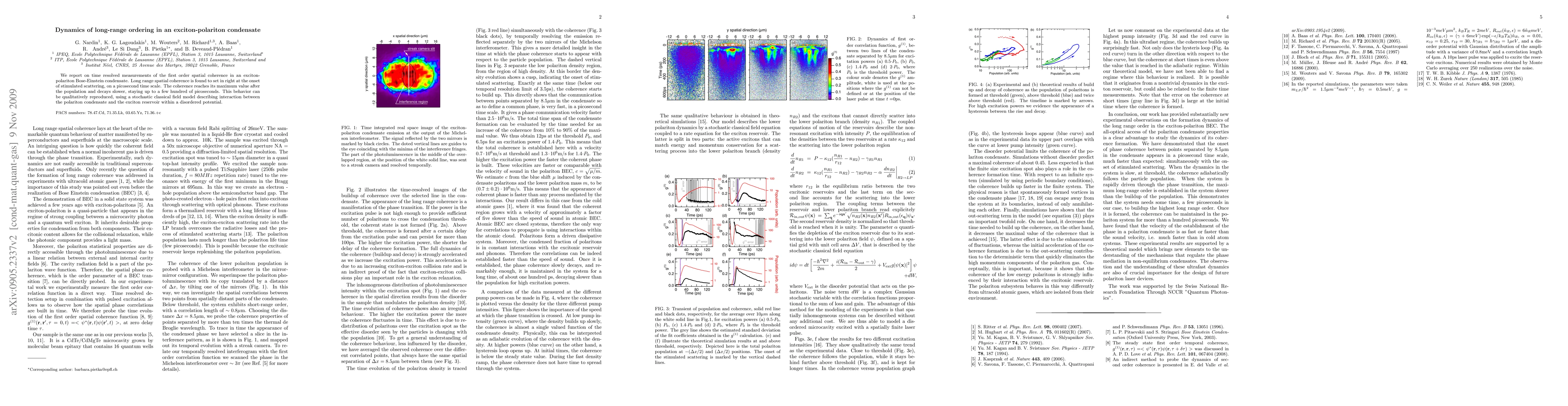 This study investigates the dynamics of long-range order in an exciton-polariton condensate, revealing that spatial coherence initiates at the onset of stimulated scattering on picosecond timescales and decays over hundreds of picoseconds, which is modeled using a stochastic classical field approach.