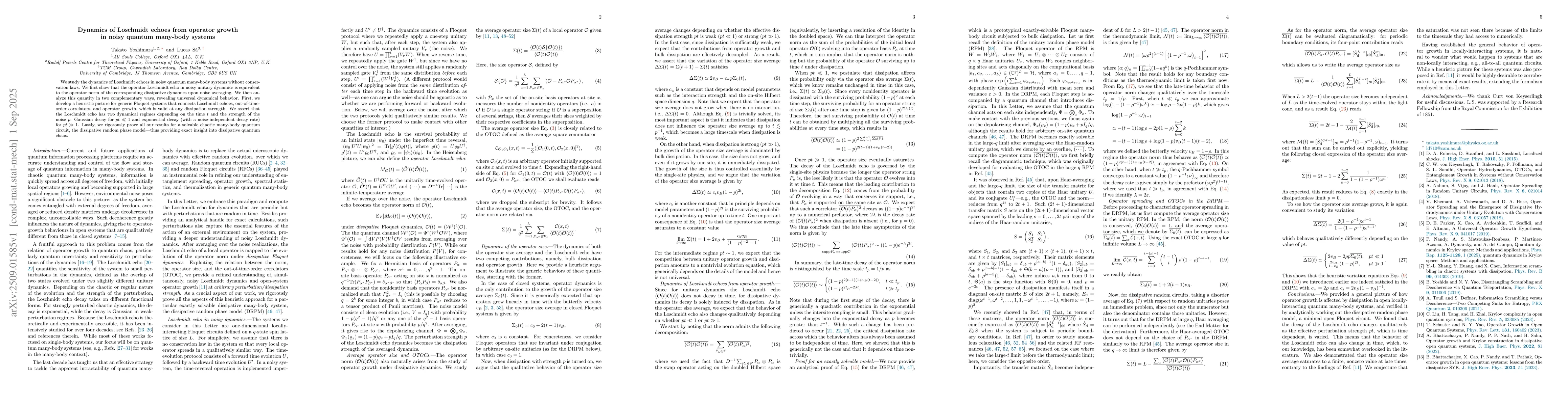 We study the dynamics of Loschmidt echoes in noisy quantum many-body systems without conservation laws. We first show that the operator Loschmidt echo in noisy unitary dynamics is equivalent to the operator norm of the corresponding dissipative dynamics upon noise averaging. We then analyze this quantity in two complementary ways, revealing universal dynamical behavior. First, we develop a heuristic picture for generic Floquet systems that connects Loschmidt echoes, out-of-time-order correlators, and operator growth, which is valid at any dissipation strength. We assert that the Loschmidt echo has two dynamical regimes depending on the time $t$ and the strength of the noise $p$: Gaussian decay for $pt\ll1$ and exponential decay (with a noise-independent decay rate) for $pt\gg1$. Lastly, we rigorously prove all our results for a solvable chaotic many-body quantum circuit, the dissipative random phase model -- thus providing exact insight into dissipative quantum chaos.