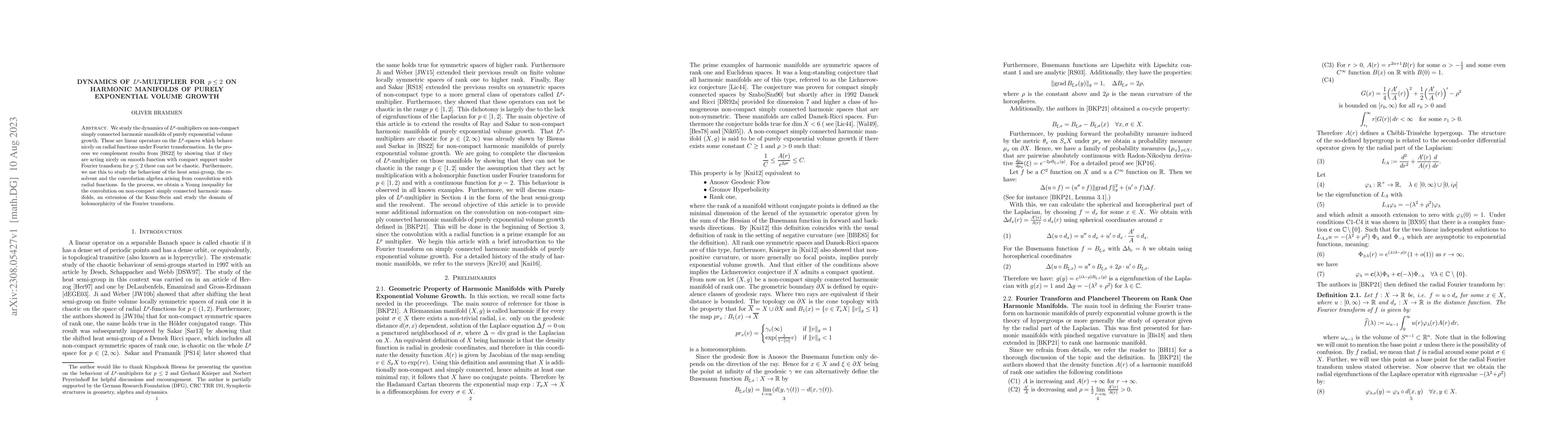 This paper investigates the dynamics of $L^p$-multipliers on non-compact harmonic manifolds with purely exponential volume growth, proving that such multipliers cannot be chaotic for $p\leq 2$. It also extends results on the heat semi-group, resolvent, and convolution algebra, establishing a Young inequality for convolution on these manifolds.