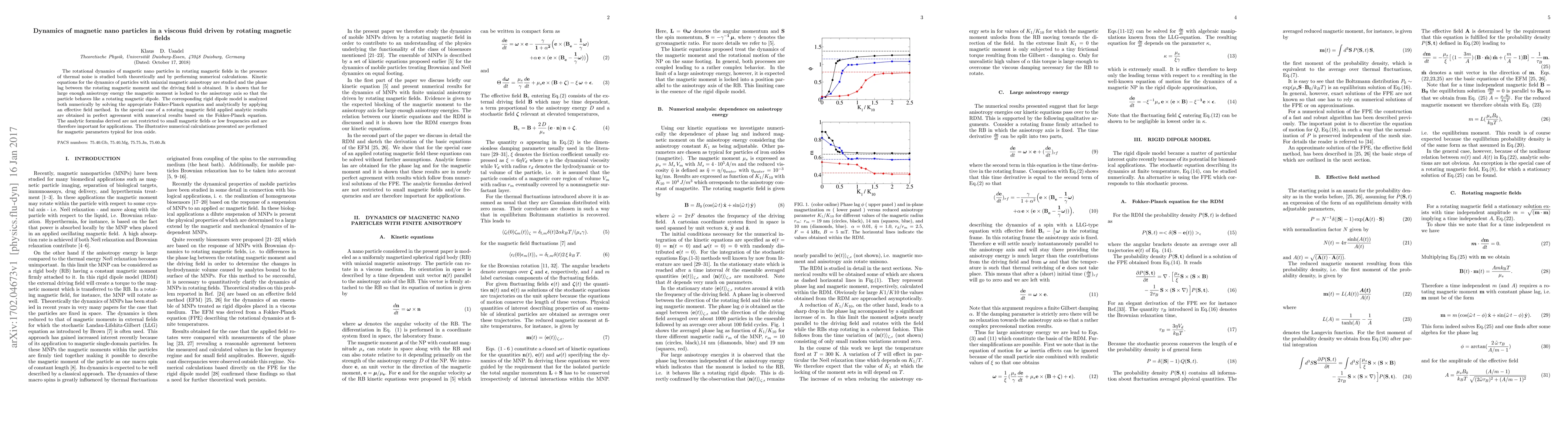 The rotational dynamics of magnetic nano particles in rotating magnetic fields in the presence of thermal noise is studied both theoretically and by performing numerical calculations. Kinetic equations for the dynamics of particles with uniaxial magnetic anisotropy are studied and the phase lag between the rotating magnetic moment and the driving field is obtained. It is shown that for large enough anisotropy energy the magnetic moment is locked to the anisotropy axis so that the particle behaves like a rotating magnetic dipole. The corresponding rigid dipole model is analyzed both numerically by solving the appropriate Fokker-Planck equation and analytically by applying an effective field method. In the special case of a rotating magnetic field applied analytic results are obtained in perfect agreement with numerical results based on the Fokker-Planck equation. The analytic formulas derived are not restricted to small magnetic fields or low frequencies and are therefore important for applications. The illustrative numerical calculations presented are performed for magnetic parameters typical for iron oxide.