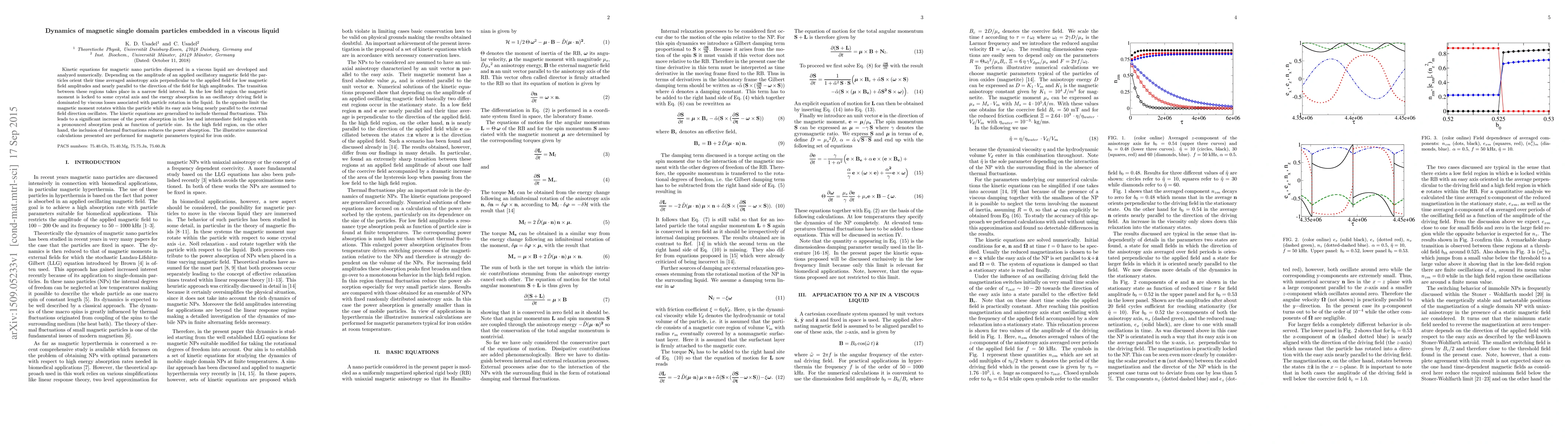 Kinetic equations for magnetic nano particles dispersed in a viscous liquid are developed and analyzed numerically. Depending on the amplitude of an applied oscillatory magnetic field the particles orient their time averaged anisotropy axis perpendicular to the applied field for low magnetic field amplitudes and nearly parallel to the direction of the field for high amplitudes. The transition between these regions takes place in a narrow field interval. In the low field region the magnetic moment is locked to some crystal axis and the energy absorption in an oscillatory driving field is dominated by viscous losses associated with particle rotation in the liquid. In the opposite limit the magnetic moment rotates within the particle while its easy axis being nearly parallel to the external field direction oscillates. The kinetic equations are generalized to include thermal fluctuations. This leads to a significant increase of the power absorption in the low and intermediate field region with a pronounced absorption peak as function of particle size. In the high field region, on the other hand, the inclusion of thermal fluctuations reduces the power absorption. The illustrative numerical calculations presented are performed for magnetic parameters typical for iron oxide.