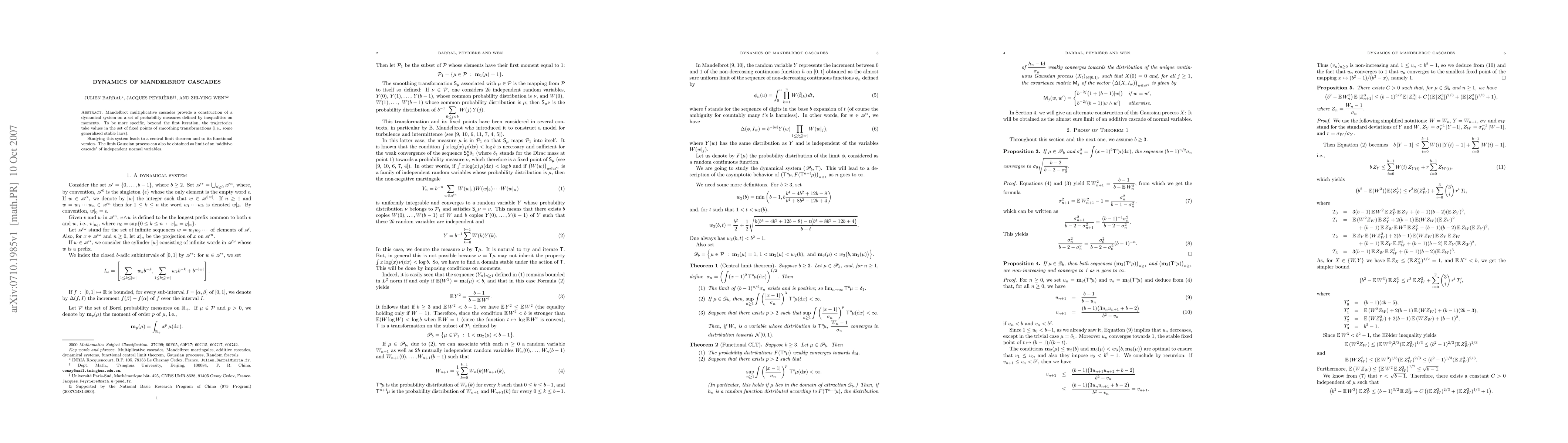 This paper explores Mandelbrot multiplicative cascades, constructing a dynamical system on probability measures defined by moment inequalities, leading to a central limit theorem and a functional version. The system's trajectories converge to fixed points of smoothing transformations, akin to generalized stable laws.