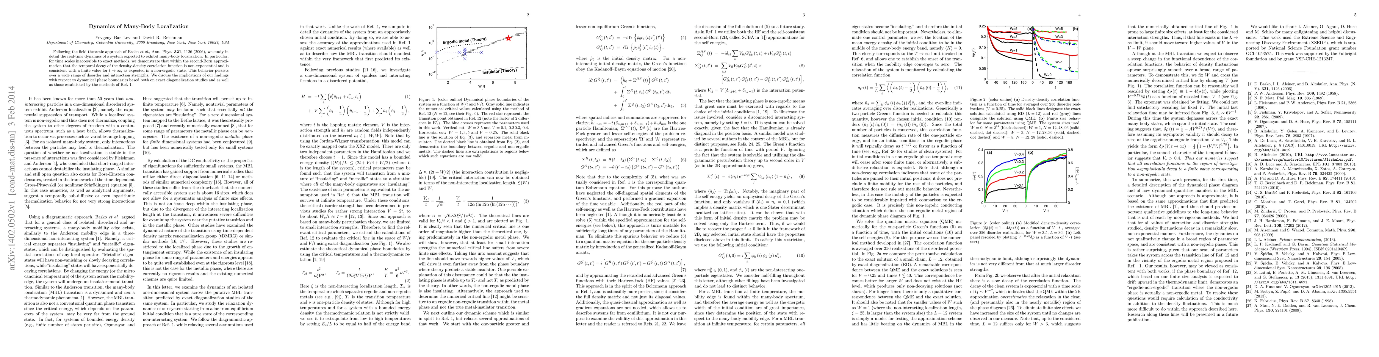 Following the field theoretic approach of Basko et al., Ann. Phys. 321, 1126 (2006), we study in detail the real-time dynamics of a system expected to exhibit many-body localization. In particular, for time scales inaccessible to exact methods, we demonstrate that within the second-Born approximation that the temporal decay of the density-density correlation function is non-exponential and is consistent with a finite value for $t\to\infty$, as expected in a non-ergodic state. This behavior persists over a wide range of disorder and interaction strengths. We discuss the implications of our findings with respect to dynamical phase boundaries based both on exact diagonalization studies and as well as those established by the methods of Ref. 1.