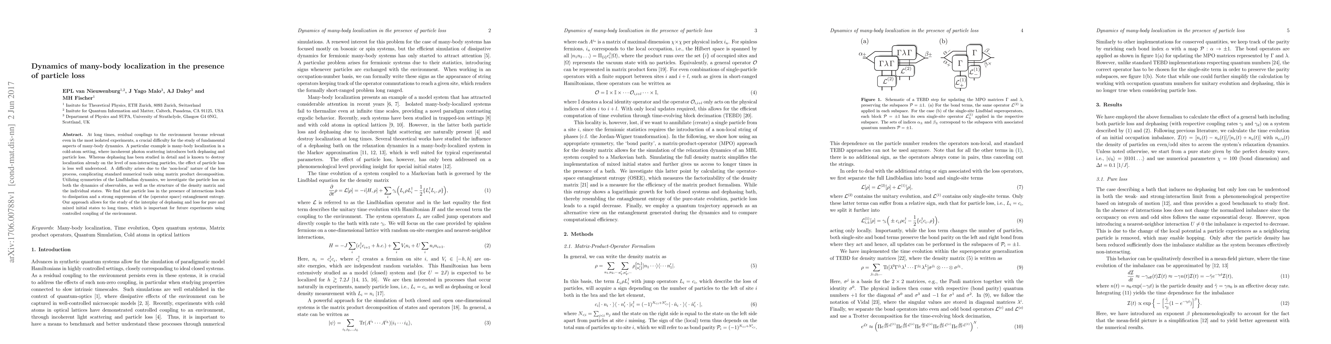 At long times residual couplings to the environment become relevant even in the most isolated experiments, creating a crucial difficulty for the study of fundamental aspects of many-body dynamics. A particular example is many-body localization in a cold-atom setting, where incoherent photon scattering introduces both dephasing and particle loss. Whereas dephasing has been studied in detail and is known to destroy localization already on the level of non-interacting particles, the effect of particle loss is less well understood. A difficulty arises due to the `non-local' nature of the loss process, complicating standard numerical tools using matrix product decomposition. Utilizing symmetries of the Lindbladian dynamics, we investigate the particle loss on both the dynamics of observables, as well as the structure of the density matrix and the individual states. We find that particle loss in the presence of interactions leads to dissipation and a strong suppression of the (operator space) entanglement entropy. Our approach allows for the study of the interplay of dephasing and loss for pure and mixed initial states to long times, which is important for future experiments using controlled coupling of the environment.