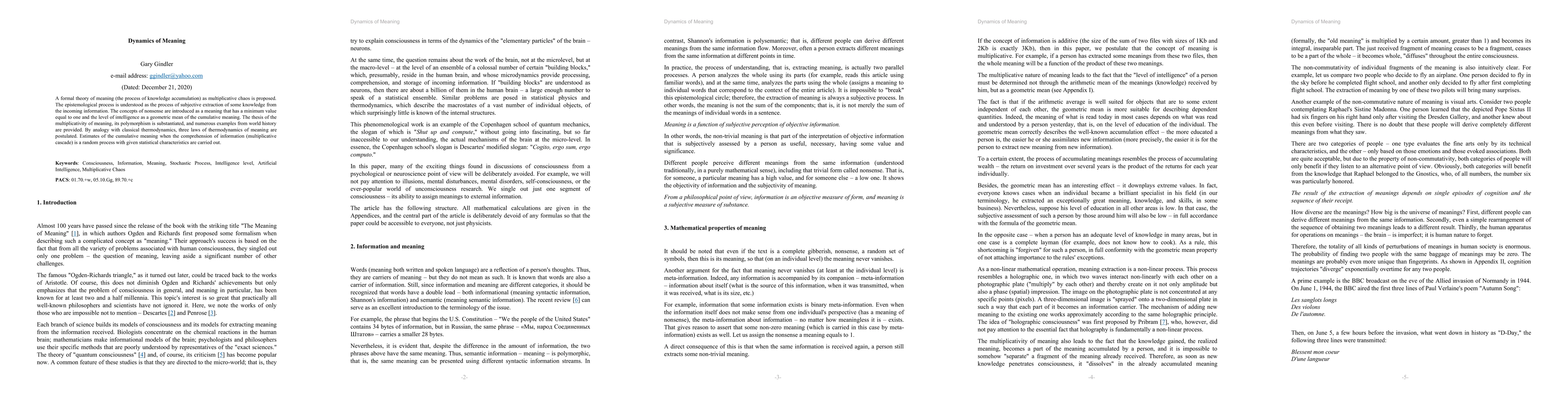 The paper proposes a formal theory of meaning as multiplicative chaos, emphasizing the subjective extraction of knowledge from information. It introduces concepts like nonsense and intelligence levels, and postulates three laws of thermodynamics of meaning, supported by historical examples and statistical estimates of cumulative meaning.