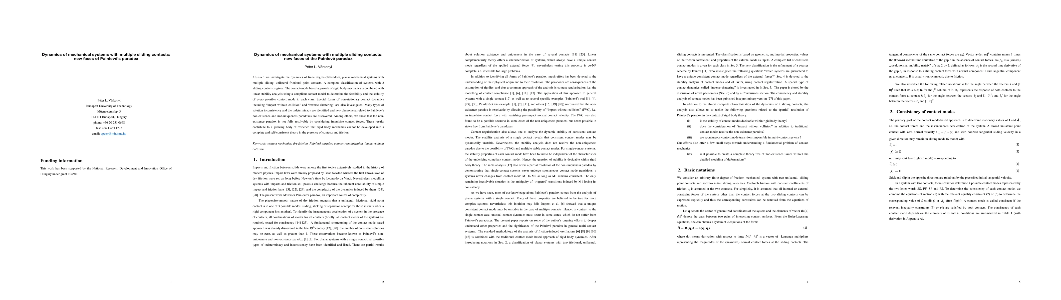 This paper explores the dynamics of planar mechanical systems with multiple sliding contacts, classifying systems with two contacts and analyzing their stability. It reveals new phenomena related to Painlevé's paradoxes, showing that rigid body mechanics faces challenges in becoming a complete theory when dealing with frictional contacts.