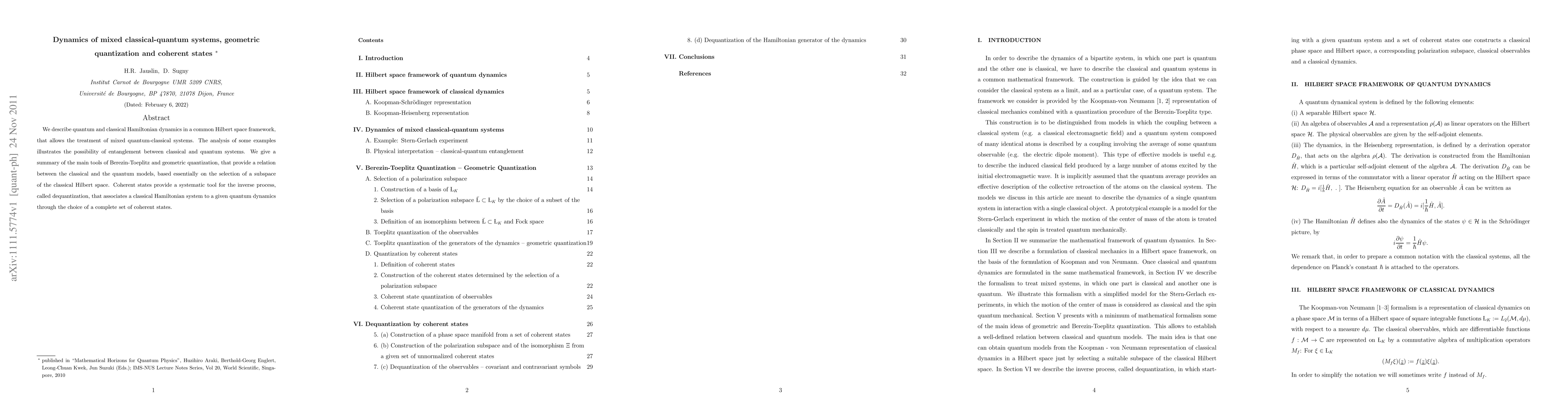 This paper explores the dynamics of mixed classical-quantum systems within a unified Hilbert space framework, highlighting entanglement possibilities between classical and quantum components. It employs Berezin-Toeplitz and geometric quantization techniques to bridge classical and quantum models, and uses coherent states for dequantization, linking quantum dynamics to classical Hamiltonian systems.