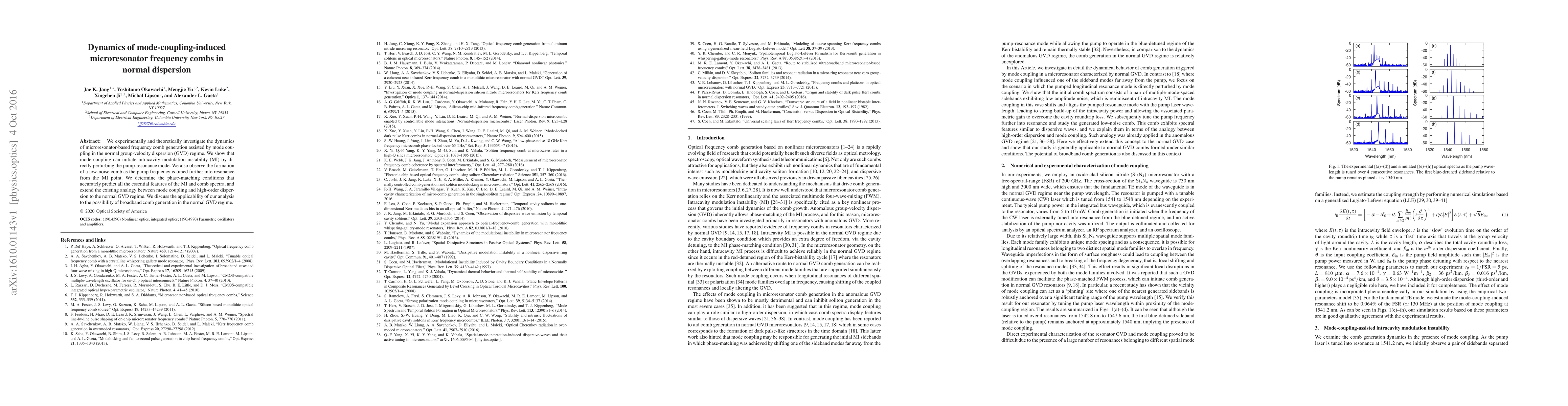 This paper investigates the dynamics of microresonator frequency combs generated through mode coupling in the normal group-velocity dispersion regime, demonstrating the initiation of intracavity modulation instability and the formation of a low-noise comb. The study provides phase-matching conditions and extends the analogy between mode coupling and high-order dispersion to normal GVD, discussing potential broadband comb generation.