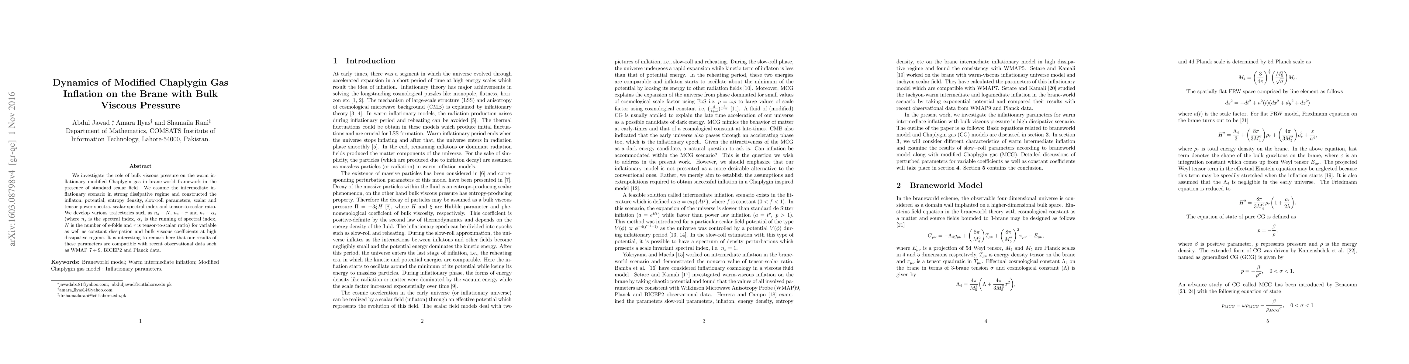 We investigate the role of bulk viscous pressure on the warm inflationary modified Chaplygin gas in brane-world framework in the presence of standard scalar field. We assume the intermediate inflationary scenario in strong dissipative regime and constructed the inflaton, potential, entropy density, slow-roll parameters, scalar and tensor power spectra, scalar spectral index and tensor-to-scalar ratio. We develop various trajectories such as $n_s - N$, $n_s - r$ and $n_s - \alpha_s$ (where $n_s$ is the spectral index, $\alpha_s$ is the running of spectral index, $N$ is the number of e-folds and $r$ is tensor-to-scalar ratio) for variable as well as constant dissipation and bulk viscous coefficients at high dissipative regime. It is interesting to remark here that our results of these parameters are compatible with recent observational data such as WMAP $7+9$, BICEP$2$ and Planck data.