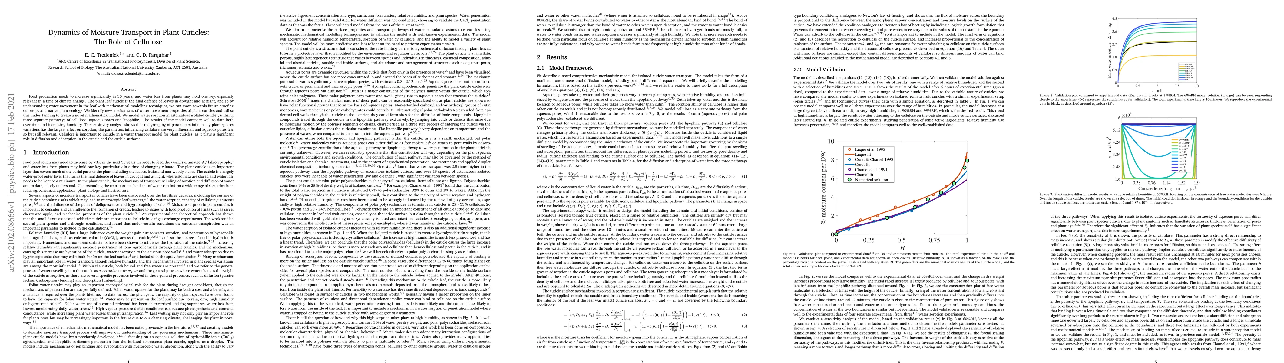This research develops a mathematical model to understand water transport in plant cuticles, focusing on the role of cellulose. It identifies cellulose as a critical factor in water movement, showing that it significantly influences water sorption, while aqueous pores play a lesser but still relevant role.