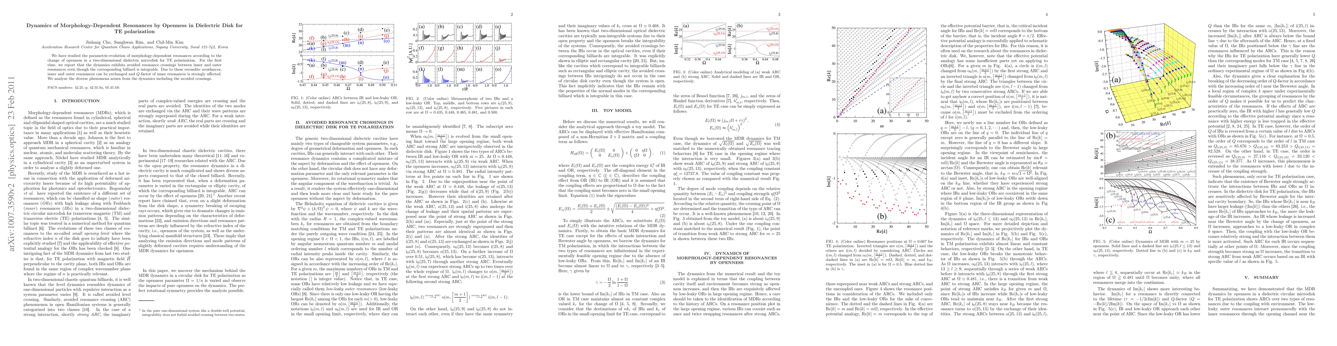 This paper investigates the dynamics of morphology-dependent resonances in dielectric microdisks under TE polarization, revealing avoided resonance crossings between inner and outer resonances despite the integrable nature of the corresponding billiard. The study highlights how these avoided crossings affect the $Q$-factor of inner resonances and explores the resulting diverse phenomena.