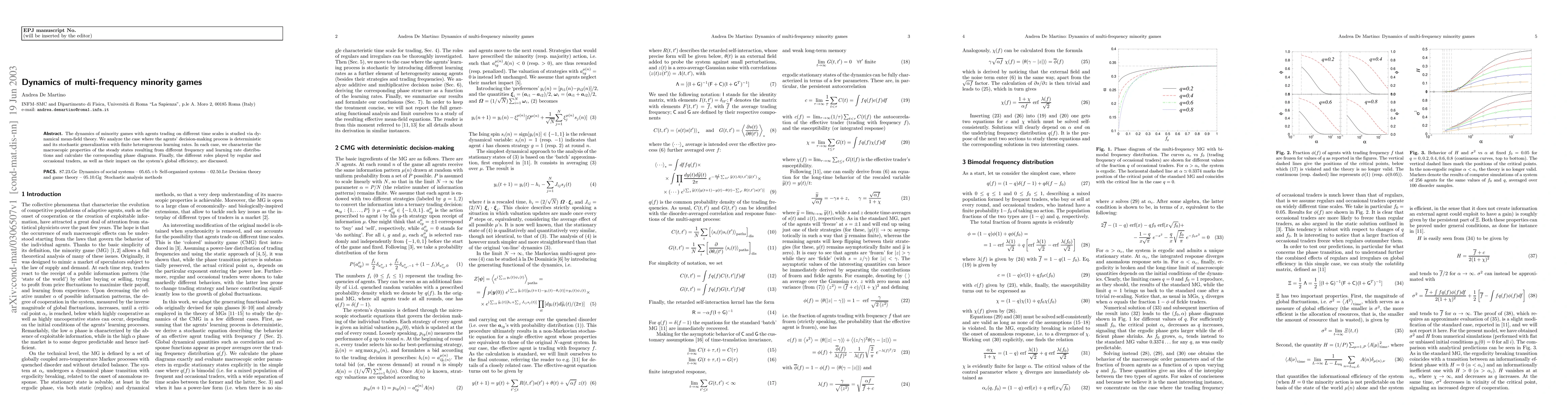 This research uses dynamical mean-field theory to examine minority games with agents trading at varying speeds. It explores deterministic and stochastic decision-making, identifying macroscopic properties and phase diagrams based on frequency and learning rate distributions. The study also discusses the roles of regular and occasional traders in the system's efficiency.