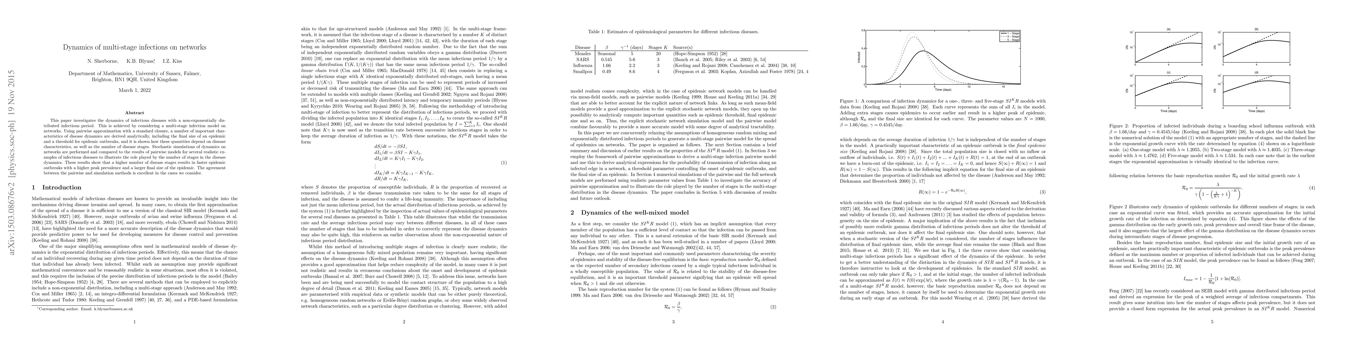 This paper investigates the dynamics of infectious diseases with a non-exponentially distributed infectious period. This is achieved by considering a multi-stage infection model on networks. Using pairwise approximation with a standard closure, a number of important characteristics of disease dynamics are derived analytically, including the final size of an epidemic and a threshold for epidemic outbreaks, and it is shown how these quantities depend on disease characteristics, as well as the number of disease stages. Stochastic simulations of dynamics on networks are performed and compared to the results of pairwise models for several realistic examples of infectious diseases to illustrate the role played by the number of stages in the disease dynamics. These results show that a higher number of disease stages results in faster epidemic outbreaks with a higher peak prevalence and a larger final size of the epidemic. The agreement between the pairwise and simulation methods is excellent in the cases we consider.