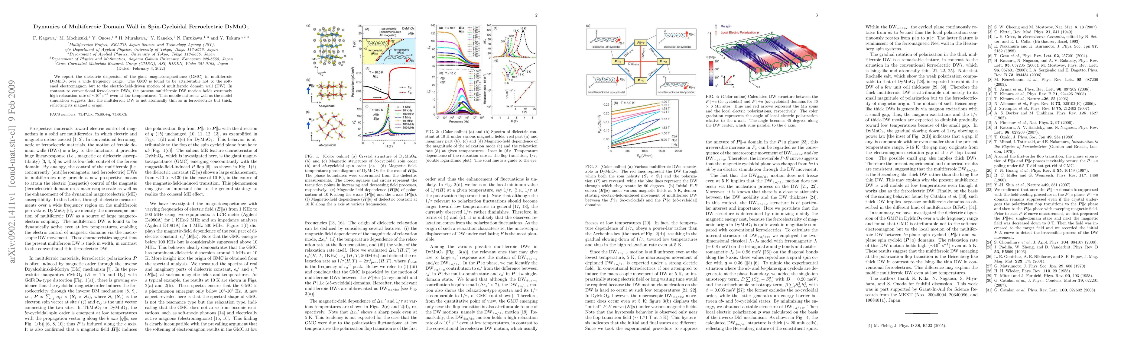 We report the dielectric dispersion of the giant magnetocapacitance (GMC) in multiferroic DyMnO$_{3}$ over a wide frequency range. The GMC is found to be attributable not to the softened electromagnon but to the electric-field-driven motion of multiferroic domain wall (DW). In contrast to conventional ferroelectric DWs, the present multiferroic DW motion holds extremely high relaxation rate of $\sim$$10^{7}$ s$^{-1}$ even at low temperatures. This mobile nature as well as the model simulation suggests that the multiferroic DW is not atomically thin as in ferroelectrics but thick, reflecting its magnetic origin.