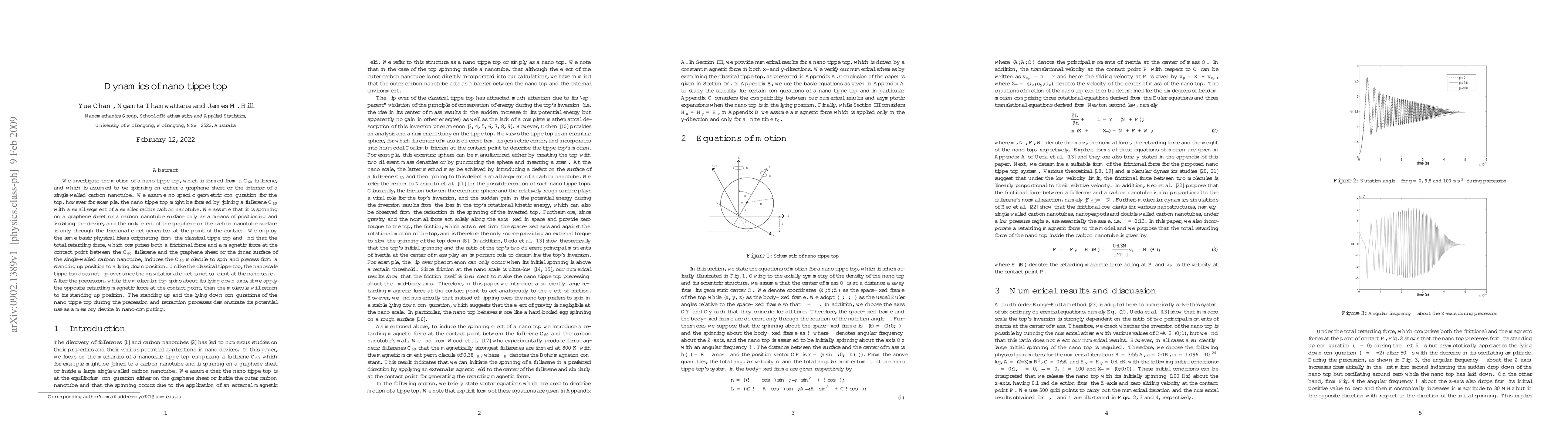 This paper explores the dynamics of a nano tippe top formed from a C60 fullerene spinning on graphene or a carbon nanotube, focusing on the frictional and magnetic forces that induce precession. Unlike classical tippe tops, the nanoscale version does not flip due to insufficient gravitational effects, but can switch between standing and lying positions, suggesting potential use as a nano-computing memory device.