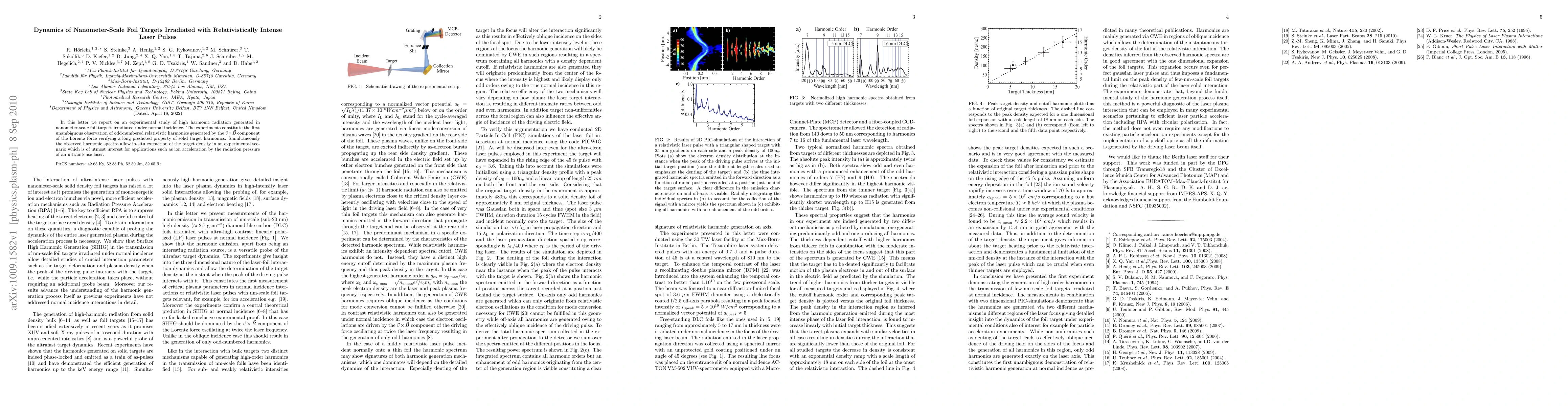 This study reports on the generation of high harmonic radiation from nanometer-scale foil targets irradiated by relativistically intense laser pulses, marking the first observation of odd-numbered relativistic harmonics due to the $\vec{v}\times\vec{B}$ Lorentz force component. The findings also enable the extraction of target density, crucial for applications like ion acceleration via laser radiation pressure.