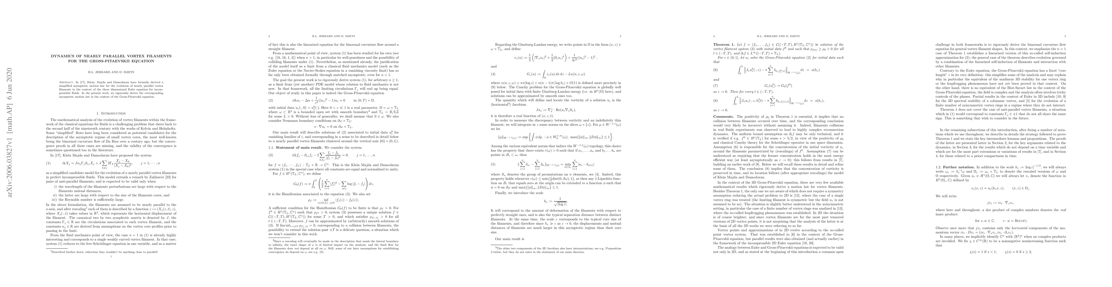 This paper rigorously derives an asymptotic motion law for nearly parallel vortex filaments in the Gross-Pitaevskii equation, extending the work of Klein, Majda, and Damodaran on the three-dimensional Euler equation for incompressible fluids.