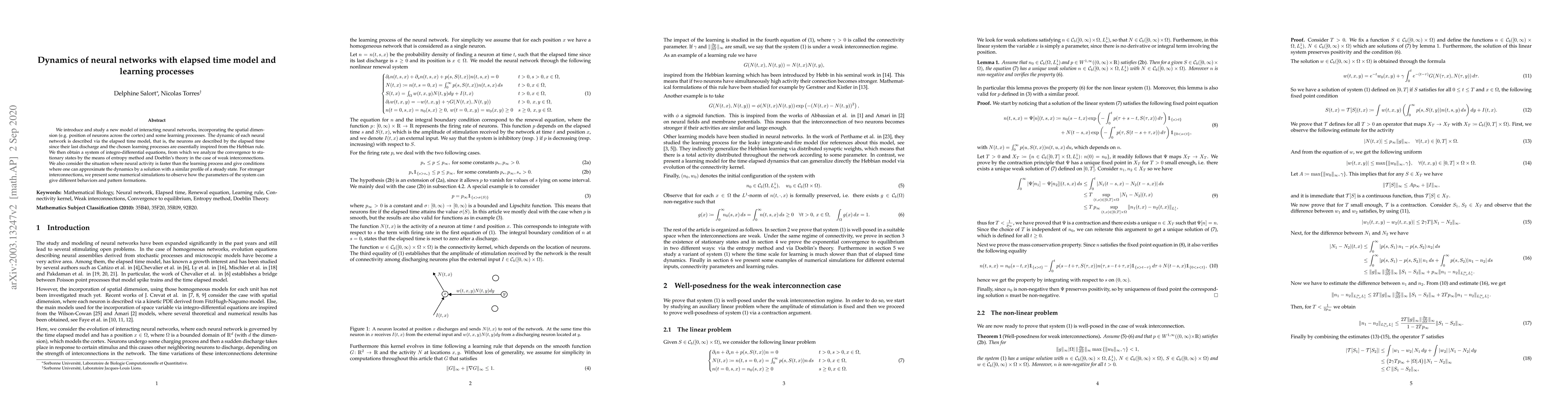 This research introduces a new model of neural networks incorporating spatial dimensions and learning processes, described by an elapsed time model and Hebbian-inspired rules. It derives a system of integro-differential equations, analyzing convergence to steady states using entropy methods and Doeblin's theory for weak interconnections. For faster neural activity, it provides conditions for approximating dynamics. Stronger interconnections are studied through numerical simulations, revealing various system behaviors and pattern formations.