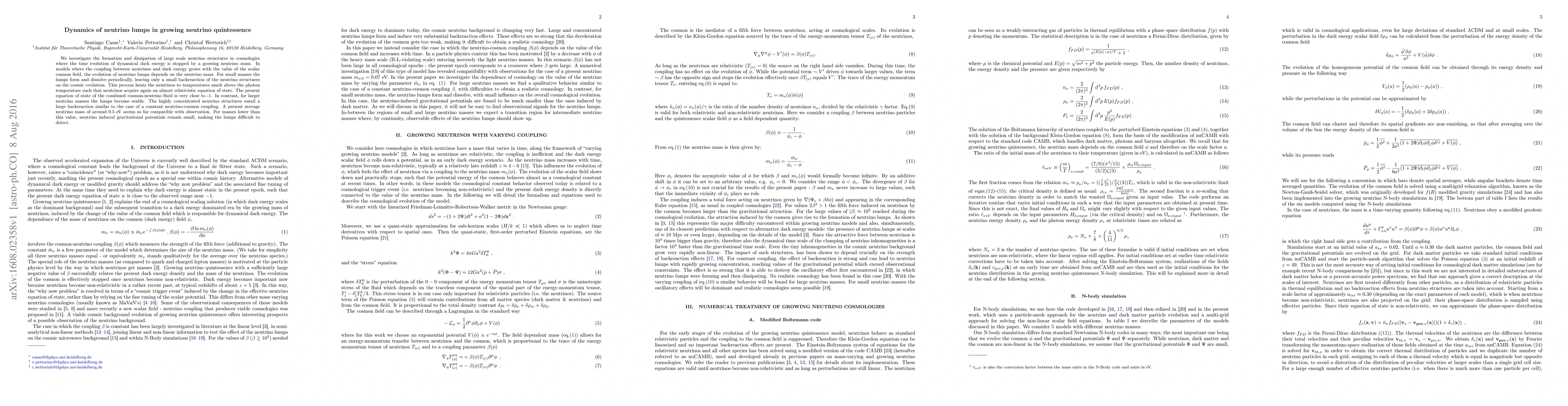 This paper explores the formation and dissipation of neutrino lumps in a cosmology where a growing neutrino mass halts the evolution of dynamical dark energy. For small neutrino masses, periodic formation and dissolution of lumps heat neutrinos to relativistic temperatures, while larger masses stabilize the lumps, significantly affecting cosmic evolution.