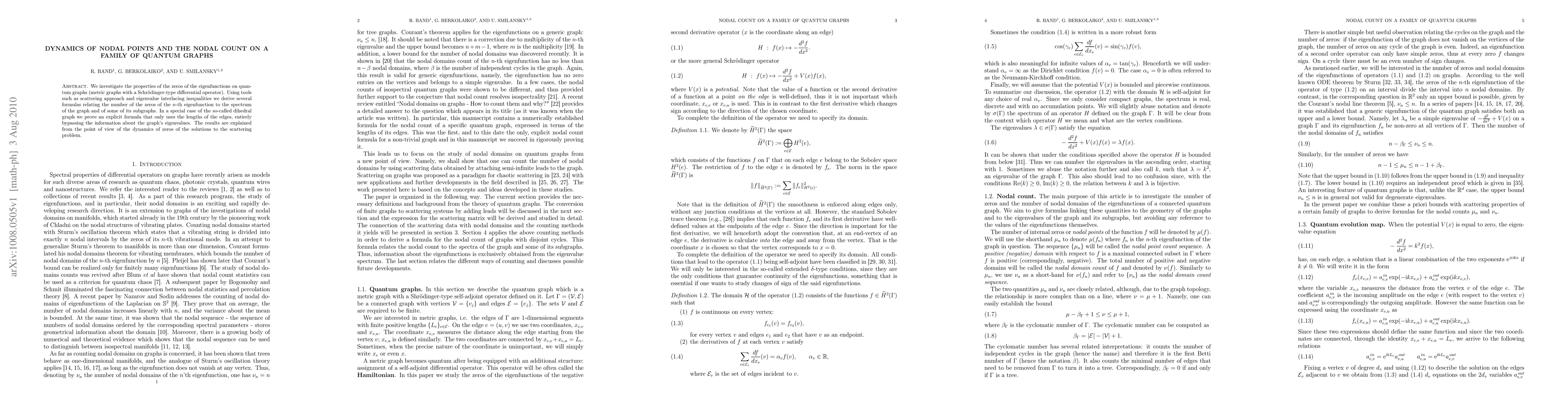 We investigate the properties of the zeros of the eigenfunctions on quantum graphs (metric graphs with a Schr\"odinger-type differential operator). Using tools such as scattering approach and eigenvalue interlacing inequalities we derive several formulas relating the number of the zeros of the n-th eigenfunction to the spectrum of the graph and of some of its subgraphs. In a special case of the so-called dihedral graph we prove an explicit formula that only uses the lengths of the edges, entirely bypassing the information about the graph's eigenvalues. The results are explained from the point of view of the dynamics of zeros of the solutions to the scattering problem.