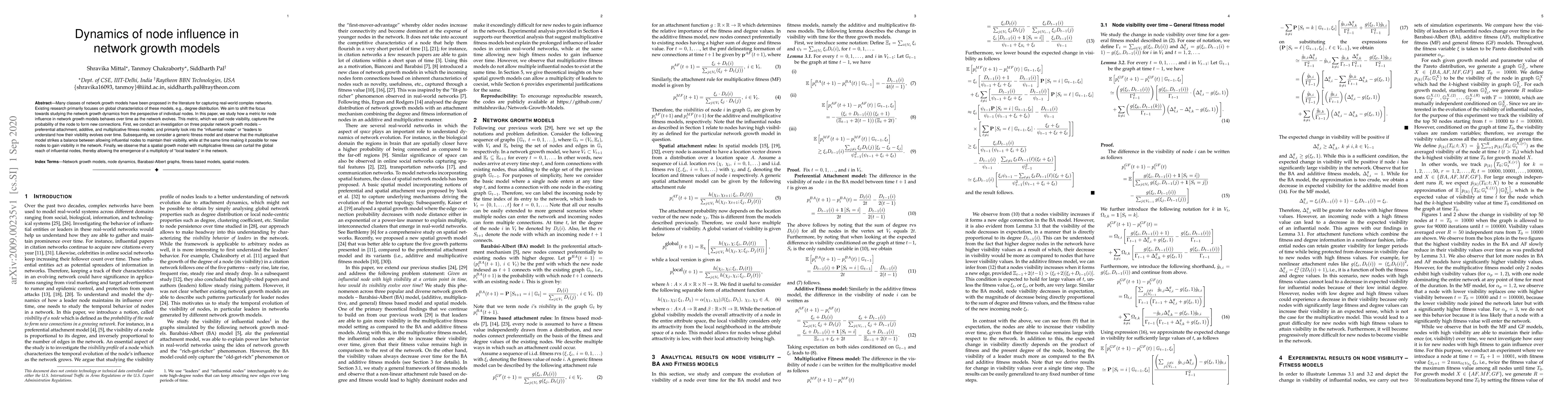This paper investigates the dynamics of node influence, termed "node visibility," in various network growth models, focusing on how influential nodes maintain or lose their prominence over time. It finds that multiplicative fitness models balance sustaining established influence while allowing new nodes to rise, and spatial growth models can foster local leaders by limiting the global reach of dominant nodes.