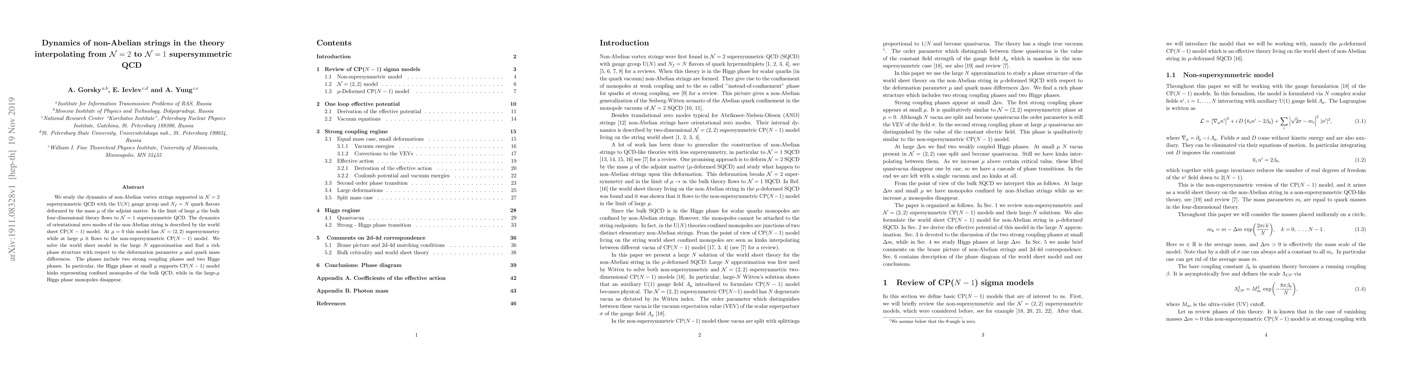 This research explores the dynamics of non-Abelian strings in ${\mathcal N}=2$ supersymmetric QCD as it transitions to ${\mathcal N}=1$ under deformation by adjoint matter mass. It identifies a rich phase structure in the world sheet CP$(N-1)$ model, including strong coupling and Higgs phases, with monopole confinement characteristics changing as the deformation parameter varies.