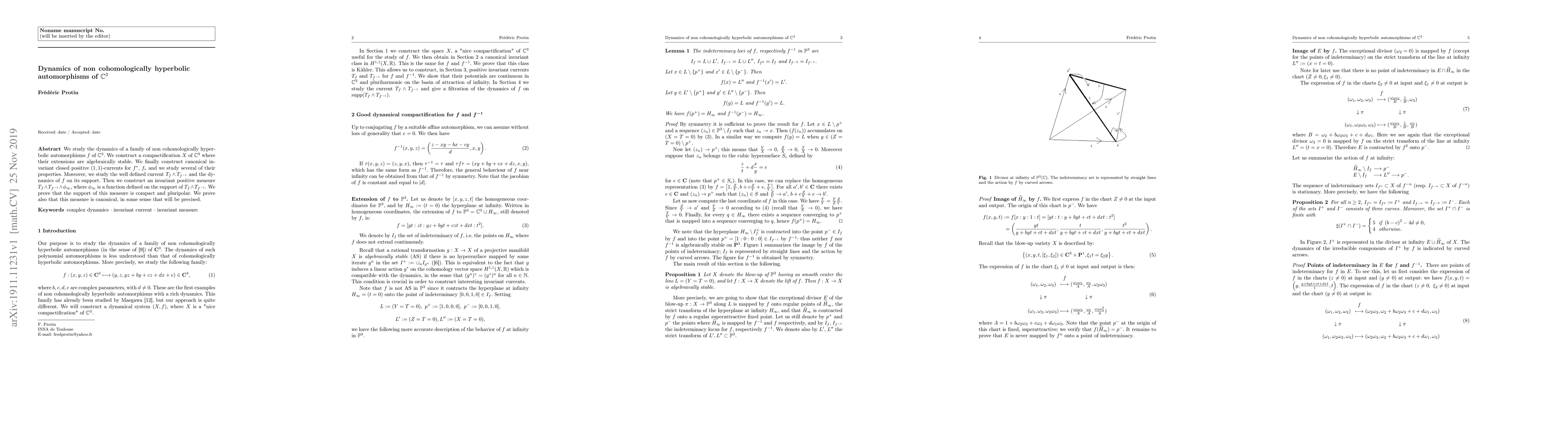 This paper investigates the dynamics of non cohomologically hyperbolic automorphisms of $\mathbb{C}^3$ by constructing a compactification $X$ where their extensions are stable. It introduces canonical invariant currents and an invariant positive measure, proving that its support is compact and pluripolar.