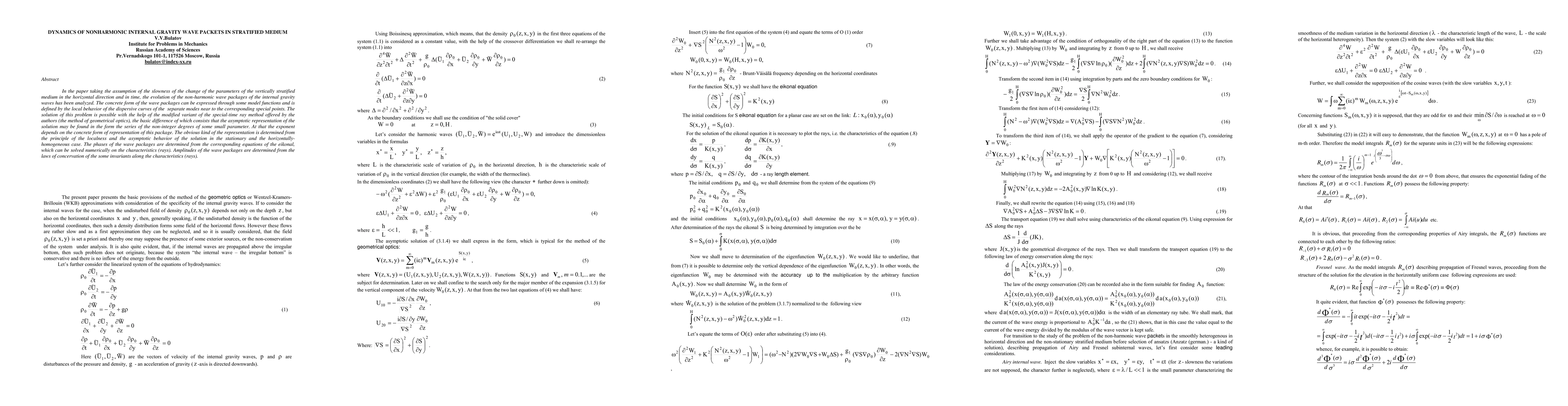 In the paper taking the assumption of the slowness of the change of the parameters of the vertically stratified medium in the horizontal direction and in time, the evolution of the non-harmonic wave packages of the internal gravity waves has been analyzed. The concrete form of the wave packages can be expressed through some model functions and is defined by the local behavior of the dispersive curves of the separate modes near to the corresponding special points. The solution of this problem is possible with the help of the modified variant of the special-time ray method offered by the authors (the method of geometrical optics), the basic difference of which consists that the asymptotic representation of the solution may be found in the form the series of the non-integer degrees of some small parameter. At that the exponent depends on the concrete form of representation of this package. The obvious kind of the representation is determined from the principle of the localness and the asymptotic behavior of the solution in the stationary and the horizontally-homogeneous case. The phases of the wave packages are determined from the corresponding equations of the eikonal, which can be solved numerically on the characteristics (rays). Amplitudes of the wave packages are determined from the laws of conservation of the some invariants along the characteristics (rays).