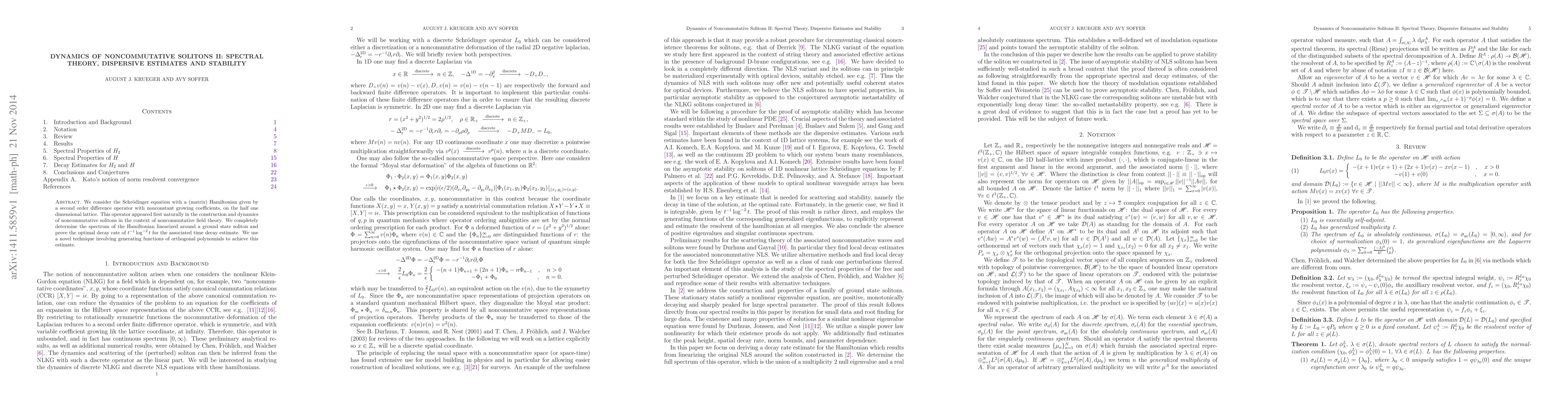 This paper investigates the spectral theory and stability of noncommutative solitons via the Schrödinger equation on a half-one dimensional lattice. It determines the spectrum of the linearized Hamiltonian around a soliton and proves an optimal dispersive decay rate using generating functions of orthogonal polynomials.