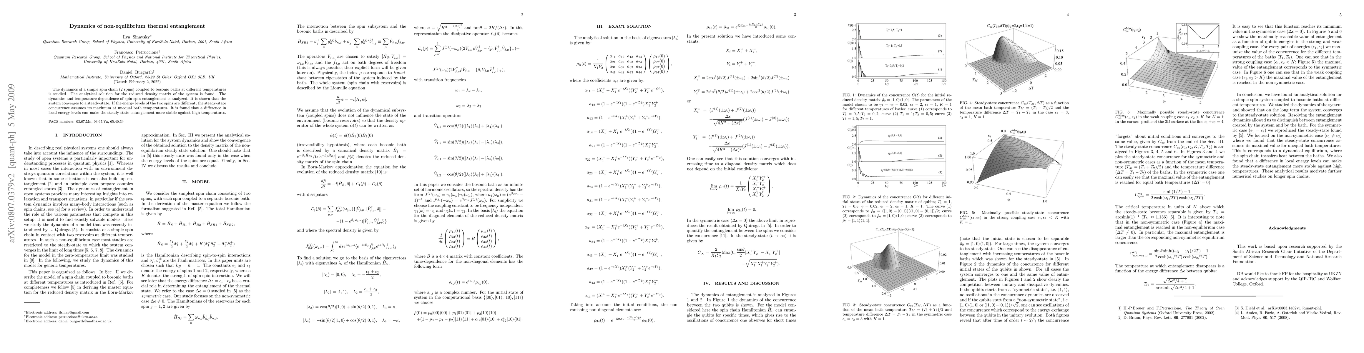 The dynamics of a simple spin chain (2 spins) coupled to bosonic baths at different temperatures is studied. The analytical solution for the reduced density matrix of the system is found. The dynamics and temperature dependence of spin-spin entanglement is analyzed. It is shown that the system converges to a steady-state. If the energy levels of the two spins are different, the steady-state concurrence assumes its maximum at unequal bath temperatures. It is found that a difference in local energy levels can make the steady-state entanglement more stable against high temperatures.