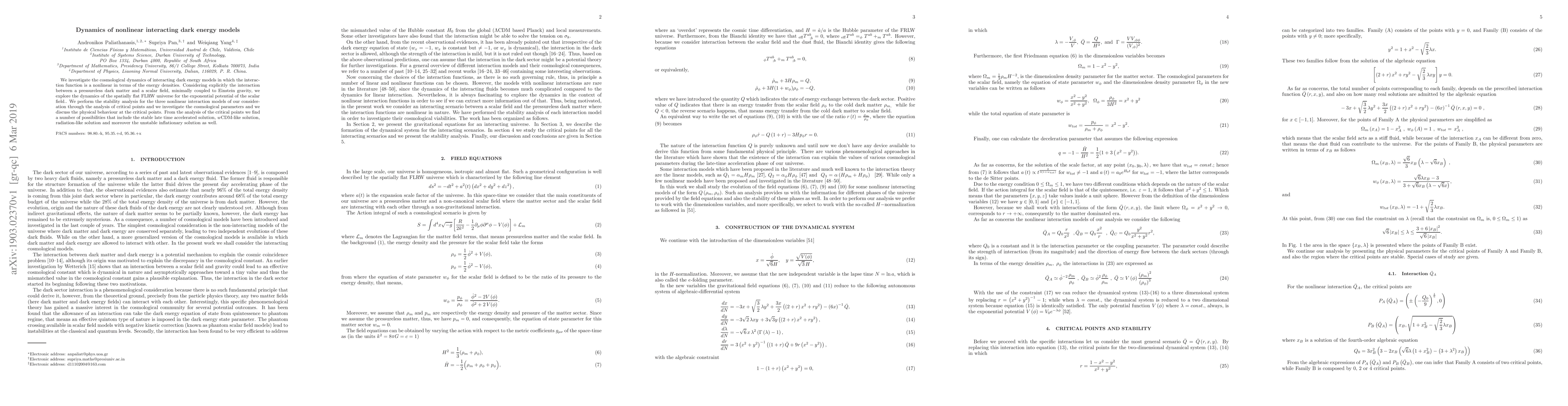 This paper explores the dynamics of nonlinear interacting dark energy models, focusing on the interaction between dark matter and a scalar field in a flat FLRW universe. It identifies stable solutions such as late-time acceleration, $w$CDM-like behavior, and radiation-like solutions, alongside an unstable inflationary solution through critical point analysis.