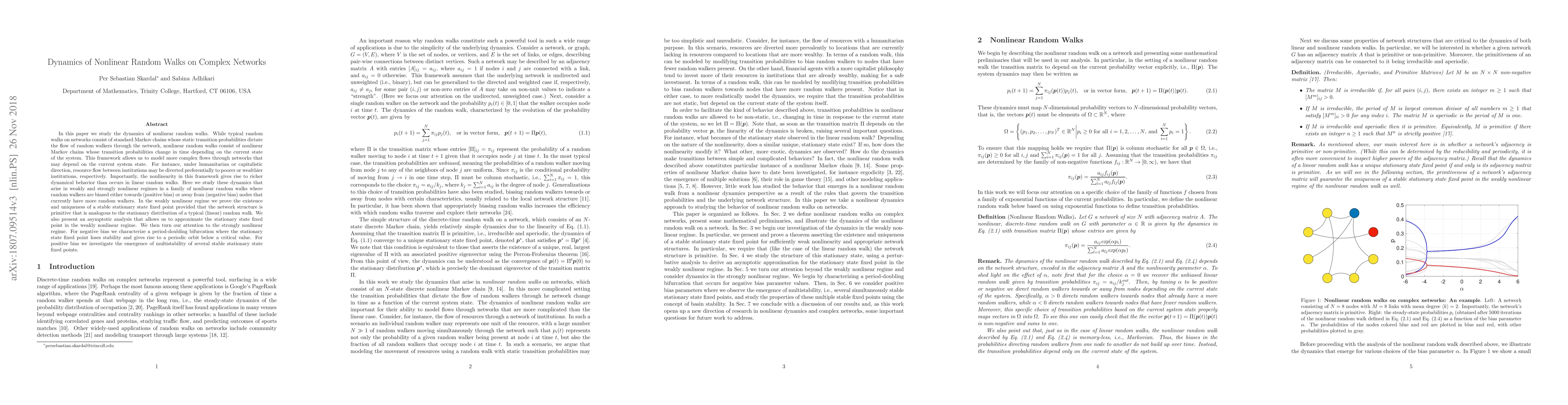 In this paper we study the dynamics of nonlinear random walks. While typical random walks on networks consist of standard Markov chains whose static transition probabilities dictate the flow of random walkers through the network, nonlinear random walks consist of nonlinear Markov chains whose transition probabilities change in time depending on the current state of the system. This framework allows us to model more complex flows through networks that may depend on the current system state. For instance, under humanitarian or capitalistic direction, resource flow between institutions may be diverted preferentially to poorer or wealthier institutions, respectively. Importantly, the nonlinearity in this framework gives rise to richer dynamical behavior than occurs in linear random walks. Here we study these dynamics that arise in weakly and strongly nonlinear regimes in a family of nonlinear random walks where random walkers are biased either towards (positive bias) or away from (negative bias) nodes that currently have more random walkers. In the weakly nonlinear regime we prove the existence and uniqueness of a stable stationary state fixed point provided that the network structure is primitive that is analogous to the stationary distribution of a typical (linear) random walk. We also present an asymptotic analysis that allows us to approximate the stationary state fixed point in the weakly nonlinear regime. We then turn our attention to the strongly nonlinear regime. For negative bias we characterize a period-doubling bifurcation where the stationary state fixed point loses stability and gives rise to a periodic orbit below a critical value. For positive bias we investigate the emergence of multistability of several stable stationary state fixed points.