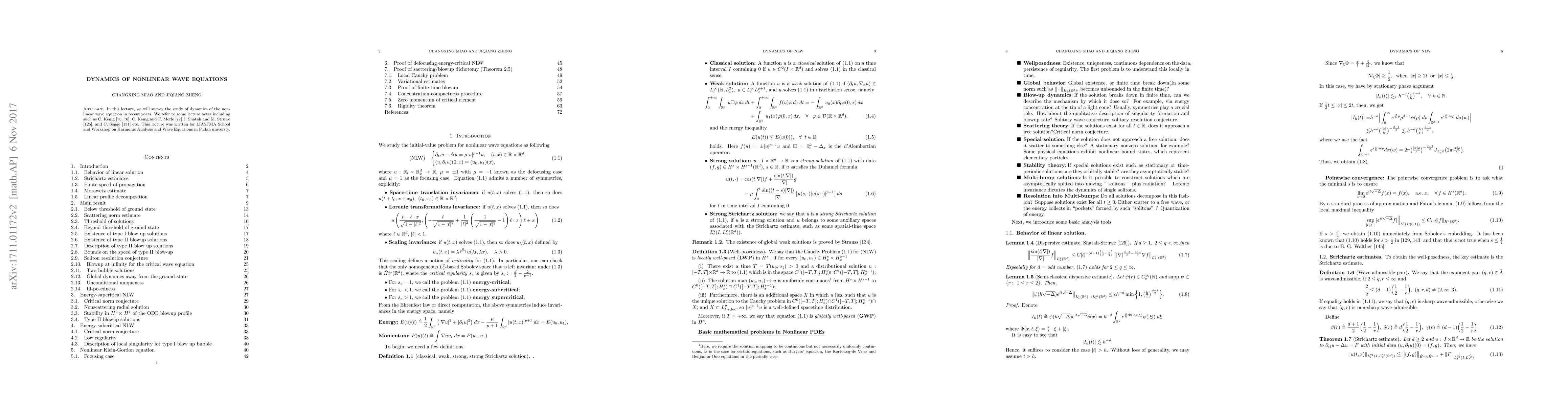 In this lecture, we will survey the study of dynamics of the nonlinear wave equation in recent years. We refer to some lecture notes including such as C. Kenig \cite{Kenig01,Kenig02}, C. Kenig and F. Merle \cite{KM1} J. Shatah and M. Struwe \cite{SS98}, and C. Sogge \cite{sogge:wave} etc. This lecture was written for LIASFMA School and Workshop on Harmonic Analysis and Wave Equations in Fudan universty.