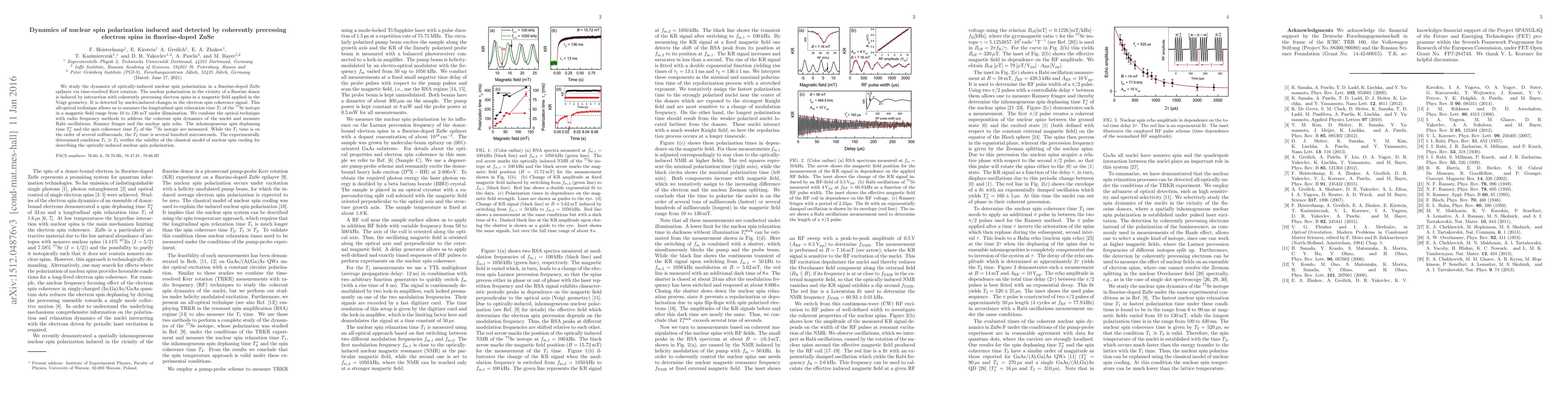 This paper investigates the dynamics of optically-induced nuclear spin polarization in fluorine-doped ZnSe using time-resolved Kerr rotation, revealing the interaction between coherently precessing electron spins and nuclear spins. The study measures the longitudinal relaxation time $T_{1}$ and spin coherence times $T_{2}$ and $T_{2}^{*}$ of the $^{77}\text{Se}$ isotope, confirming the classical model of nuclear spin cooling.