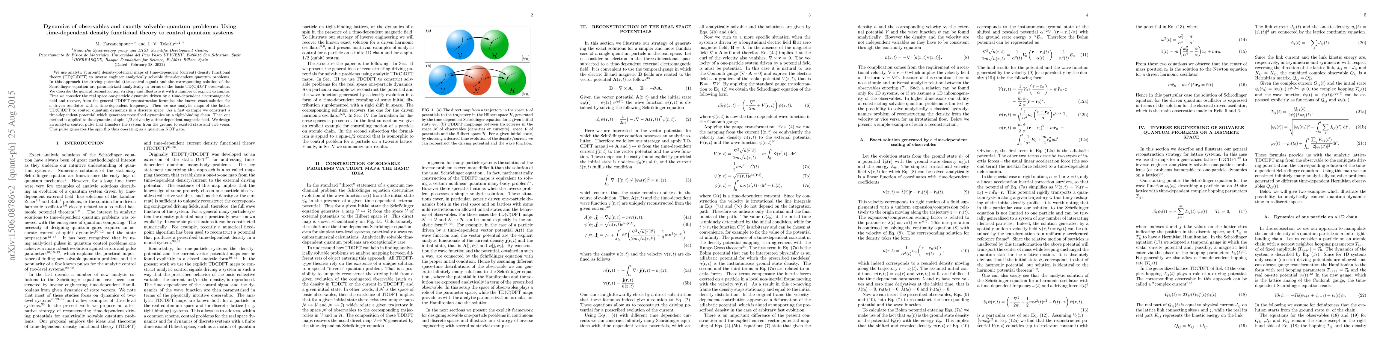 This paper explores the use of time-dependent density functional theory (TD(C)DFT) to analytically solve and control quantum systems. The authors employ TD(C)DFT observables to reconstruct exact solutions for various quantum problems, including a driven oscillator and a spin-1/2 system, demonstrating the potential for designing quantum control pulses.