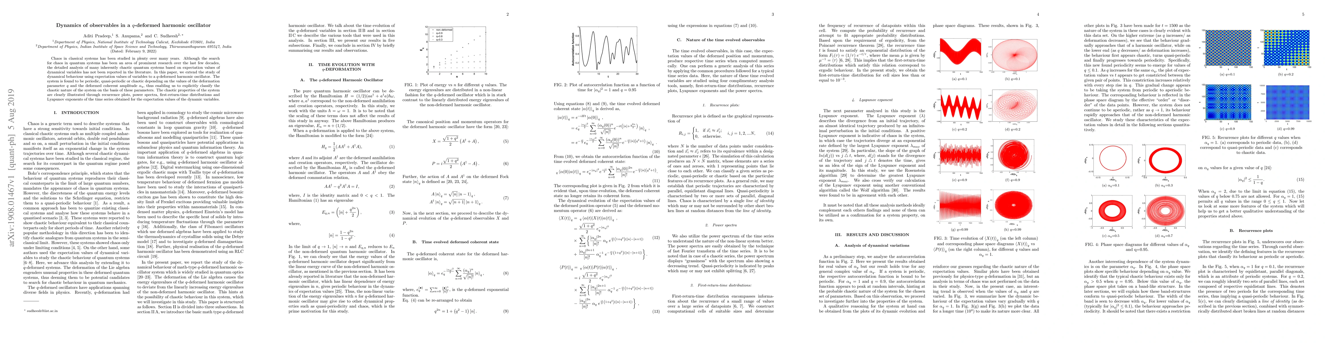 Chaos in classical systems has been studied in plenty over many years. Although the search for chaos in quantum systems has been an area of prominent research over the last few decades, the detailed analysis of many inherently chaotic quantum systems based on expectation values of dynamical variables has not been reported in the literature. In this paper, we extend the study of dynamical behaviour using expectation values of variables to a $q$-deformed harmonic oscillator. The system is found to be periodic, quasi-periodic or chaotic depending on the values of the deformation parameter $q$ and the deformed coherent amplitude $\alpha_{q}$, thus enabling us to explicitly classify the chaotic nature of the system on the basis of these parameters. The chaotic properties of the system are clearly illustrated through recurrence plots, power spectra, first-return-time distributions and Lyapunov exponents of the time series obtained for the expectation values of the dynamic variables.