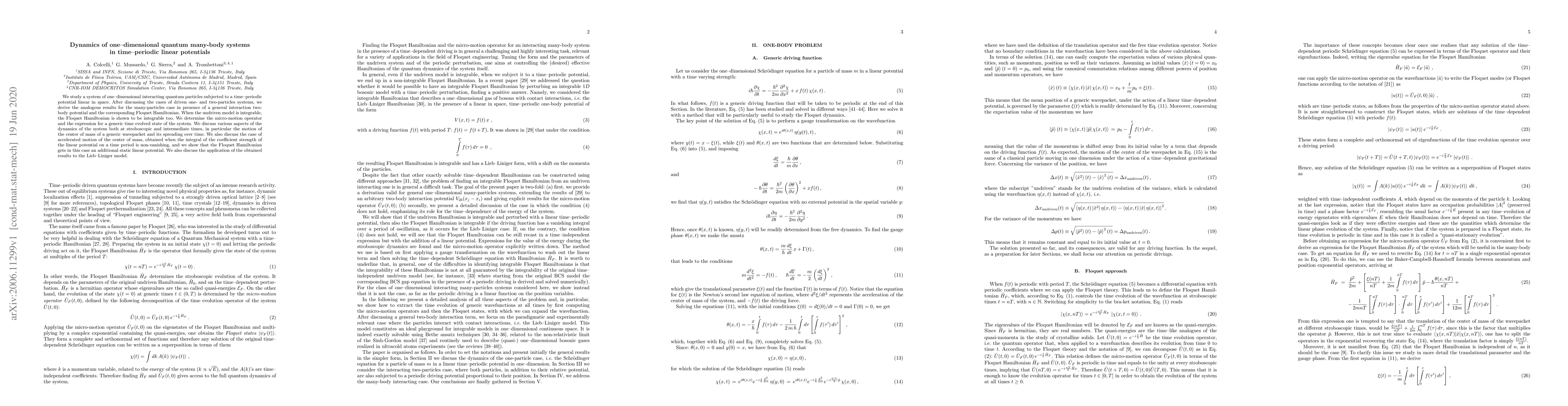 This paper investigates the dynamics of one-dimensional quantum many-body systems under time-periodic linear potentials, deriving results for both integrable and non-integrable cases, and applying these findings to the Lieb-Liniger model. It explores the motion of the center of mass and its spreading, with special attention to accelerated motion scenarios.