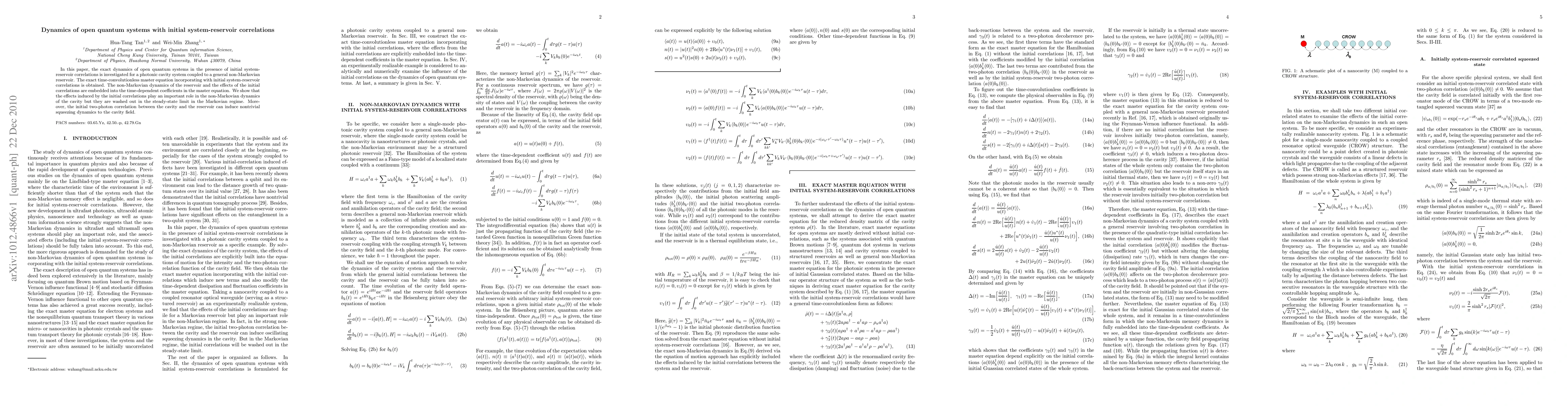 In this paper, the exact dynamics of open quantum systems in the presence of initial system-reservoir correlations is investigated for a photonic cavity system coupled to a general non-Markovian reservoir. The exact time-convolutionless master equation incorporating with initial system-reservoir correlations is obtained. The non-Markovian dynamics of the reservoir and the effects of the initial correlations are embedded into the time-dependent coefficients in the master equation. We show that the effects induced by the initial correlations play an important role in the non-Markovian dynamics of the cavity but they are washed out in the steady-state limit in the Markovian regime. Moreover, the initial two-photon correlation between the cavity and the reservoir can induce nontrivial squeezing dynamics to the cavity field.