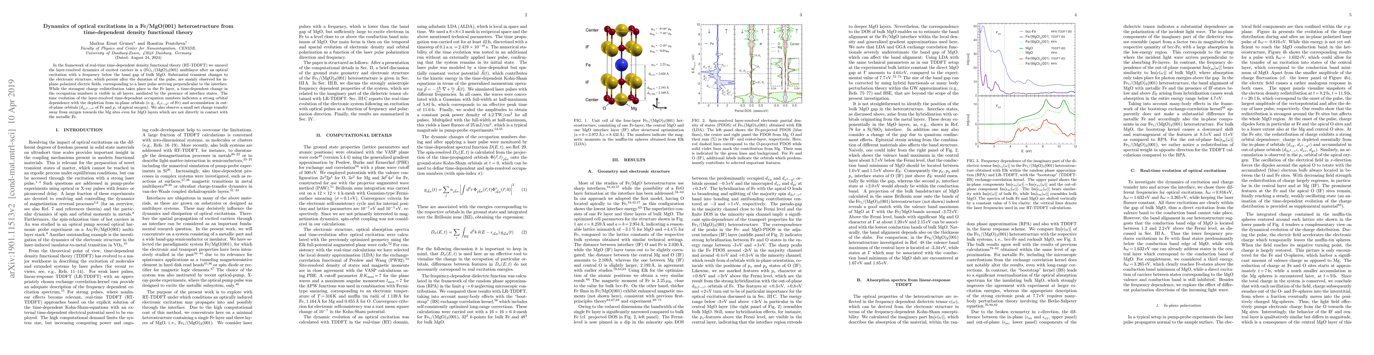 This study uses real-time time-dependent density functional theory to investigate the dynamics of electronic excitations in a Fe/MgO heterostructure after optical excitation. The analysis reveals significant transient changes in the electronic structure, especially in the Fe layer, with a notable redistribution of charges and orbital occupations, including a shift from in-plane to out-of-plane orbitals, and a small net charge transfer from oxygen to Mg sites in the MgO layers.