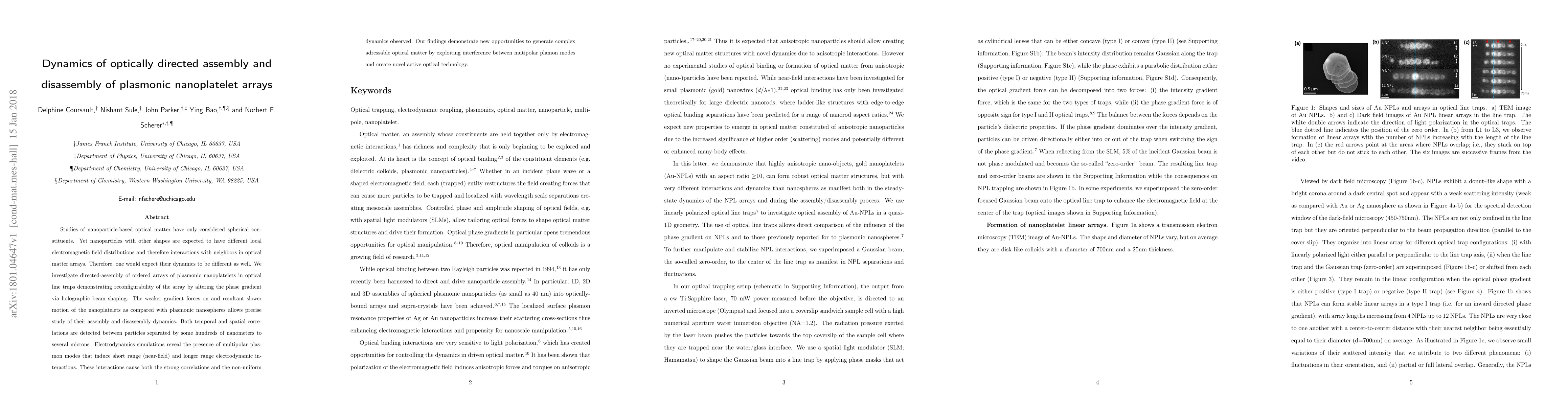 Studies of nanoparticle-based optical matter have only considered spherical constituents. Yet nanoparticles with other shapes are expected to have different local electromagnetic field distributions and therefore interactions with neighbors in optical matter arrays. Therefore, one would expect their dynamics to be different as well. We investigate directed-assembly of ordered arrays of plasmonic nanoplatelets in optical line traps demonstrating reconfigurability of the array by altering the phase gradient via holographic beam shaping. The weaker gradient forces on and resultant slower motion of the nanoplatelets as compared with plasmonic nanospheres allows precise study of their assembly and disassembly dynamics. Both temporal and spatial correlations are detected between particles separated by some hundreds of nanometers to several microns. Electrodynamics simulations reveal the presence of multipolar plasmon modes that induce short range (near-field) and longer range electrodynamic interactions. These interactions cause both the strong correlations and the non-uniform dynamics observed. Our findings demonstrate new opportunities to generate complex adressable optical matter by exploiting interference between mutipolar plamon modes and create novel active optical technology.