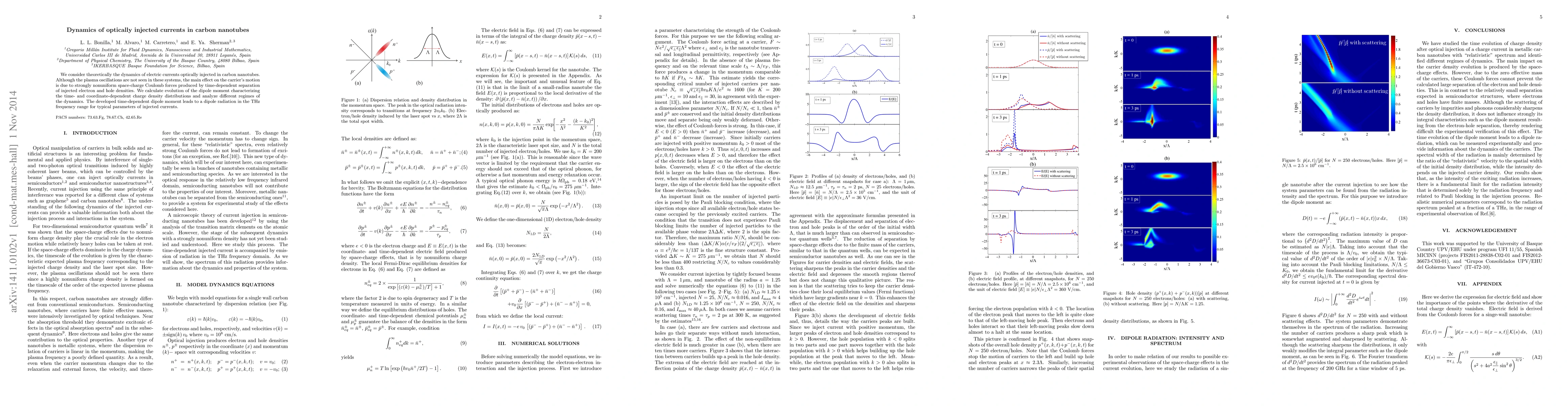 We consider theoretically the dynamics of electric currents optically injected in carbon nanotubes. Although the plasma oscillations are not seen in these systems, the main effect on the carrier's motion is due to strongly nonuniform space-charge Coulomb forces produced by time-dependent separation of injected electron and hole densities. We calculate evolution of the dipole moment characterizing the time- and coordinate-dependent charge density distributions and analyze different regimes of the dynamics. The developed time-dependent dipole moment leads to a dipole radiation in the THz frequency range for typical parameters of injected currents.