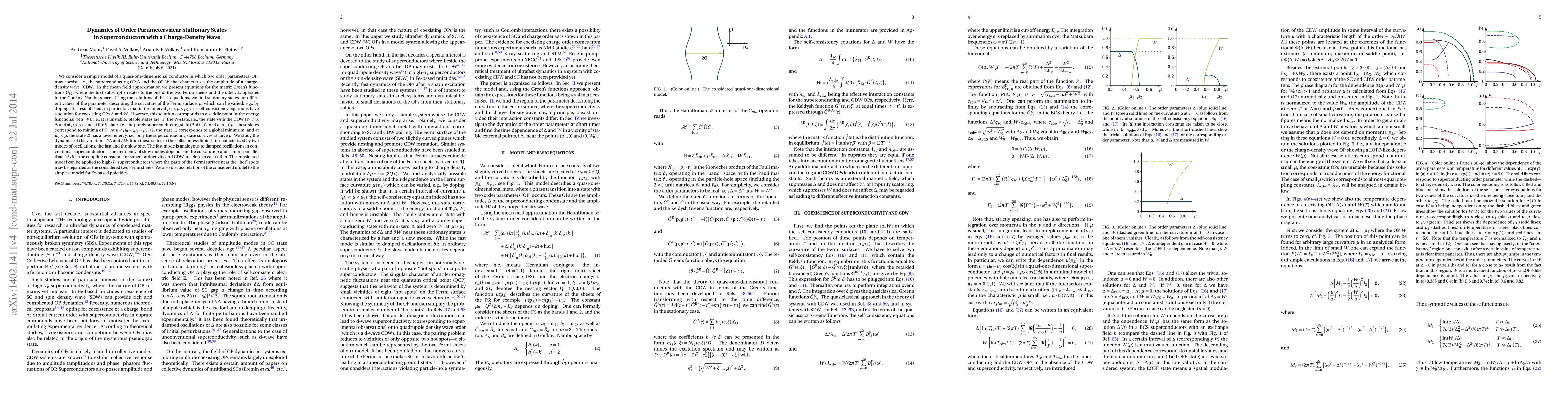 We consider a simple model of a quasi-one-dimensional conductor in which two order parameters (OP) may coexist, i.e., the superconducting OP $\Delta$ and the OP $W$ that characterizes the amplitude of a charge-density wave (CDW). In the mean field approximation we present equations for the matrix Green's functions $G_{ik}$, where $i$ relates to the one of the two Fermi sheets and $k$, operates in the Gor'kov-Nambu space. Using the solutions of these equations, we find stationary states for different values of the parameter describing the curvature of the Fermi surface, $\mu$, which can be varied, e.g., by doping. It is established that in the interval $\mu_1<\mu<\mu_2$ the self-consistency equations have a solution for coexisting OPs $\Delta$ and $W$. However, this solution corresponds to a saddle point in the energy functional $\Phi(\Delta, W)$, i.e., it is unstable. Stable states are: 1)the state with the CDW at $\mu < \mu_{2}$; and 2) the purely superconducting state at $\mu_1<\mu$. At $\mu<\mu_0$, the state 1) corresponds to a global minimum, and at $\mu_0<\mu$, the state 2) has a lower energy, i.e., only the superconducting state survives at large $\mu$. We study the dynamics of the variations $\delta\Delta$ and $\delta W$ from these states in the collisionless limit. It is characterized by two modes of oscillations, the fast and the slow one. The fast mode is analogous to damped oscillations in conventional superconductors. The frequency of slow modes depends on the curvature $\mu$ and is much smaller than $2\Delta$ if the coupling constants for superconductivity and CDW are close to each other. The considered model can be applied to high-$T_c$ superconductors where the parts of the Fermi surface near the `hot' spots may be regarded as the considered two Fermi sheets. We also discuss relation of the considered model to the simplest model for Fe-based pnictides.