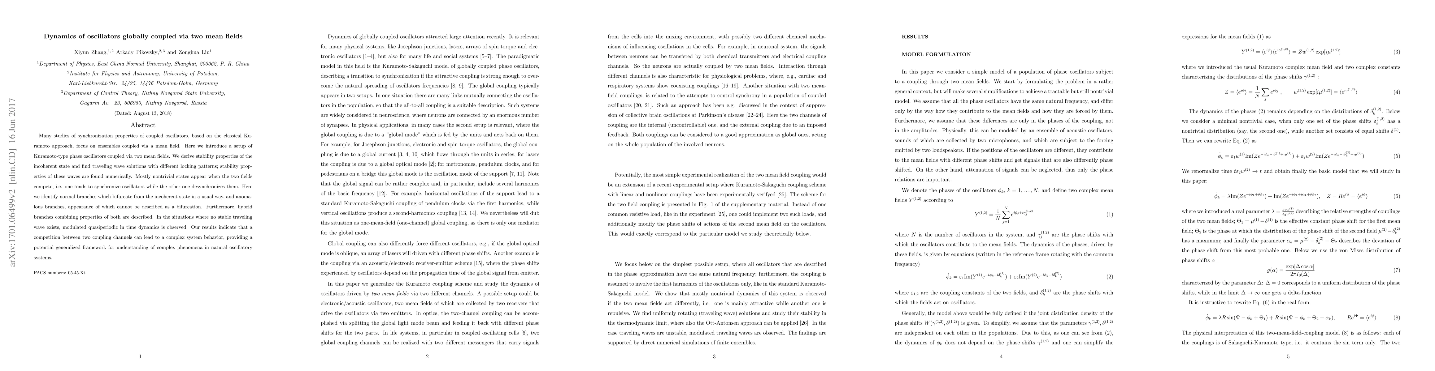 This paper explores the dynamics of Kuramoto-type oscillators globally coupled through two competing mean fields, revealing complex synchronization patterns, including traveling wave solutions and anomalous branches. The study highlights how dual coupling channels can induce intricate system behaviors, offering a generalized framework for understanding complex phenomena in natural oscillatory systems.