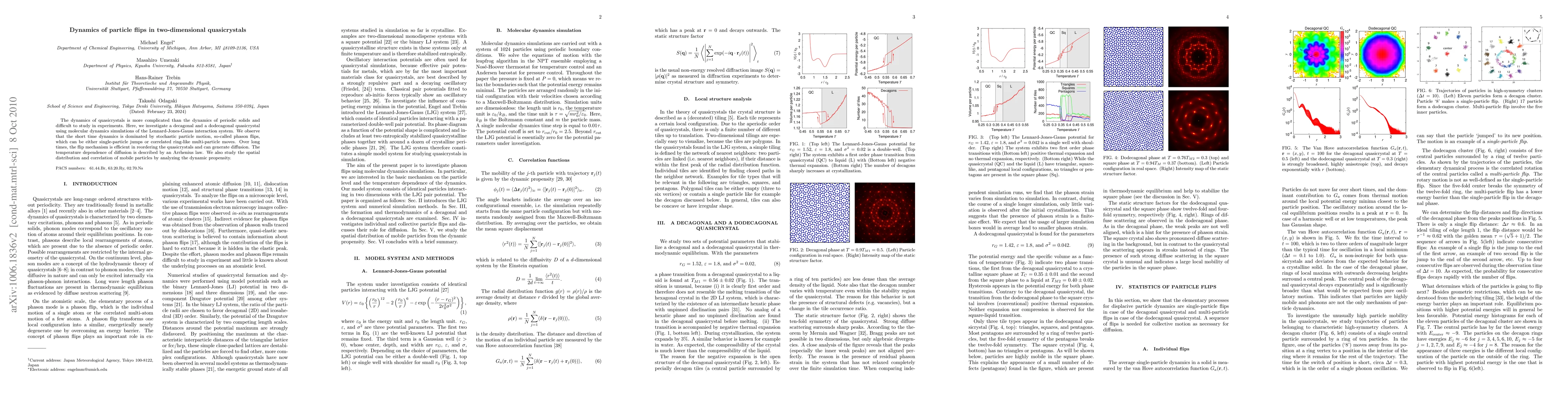 The dynamics of quasicrystals is more complicated than the dynamics of periodic solids and difficult to study in experiments. Here, we investigate a decagonal and a dodecagonal quasicrystal using molecular dynamics simulations of the Lennard-Jones-Gauss interaction system. We observe that the short time dynamics is dominated by stochastic particle motion, so-called phason flips, which can be either single-particle jumps or correlated ring-like multi-particle moves. Over long times, the flip mechanism is efficient in reordering the quasicrystals and can generate diffusion. The temperature dependence of diffusion is described by an Arrhenius law. We also study the spatial distribution and correlation of mobile particles by analyzing the dynamic propensity.
