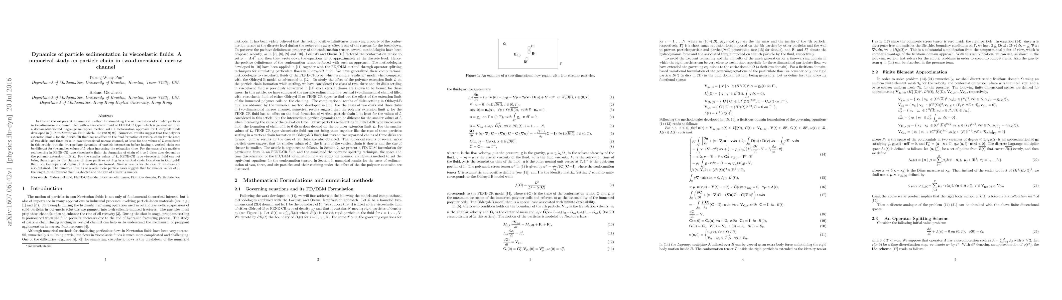 This paper presents a numerical study on the sedimentation of circular particles in a two-dimensional viscoelastic fluid channel, showing that the polymer extension limit L affects particle chain formation dynamics but not the final vertical chain formation for two or three disks. For six or more disks, smaller L values lead to separate chains instead of a single vertical chain.